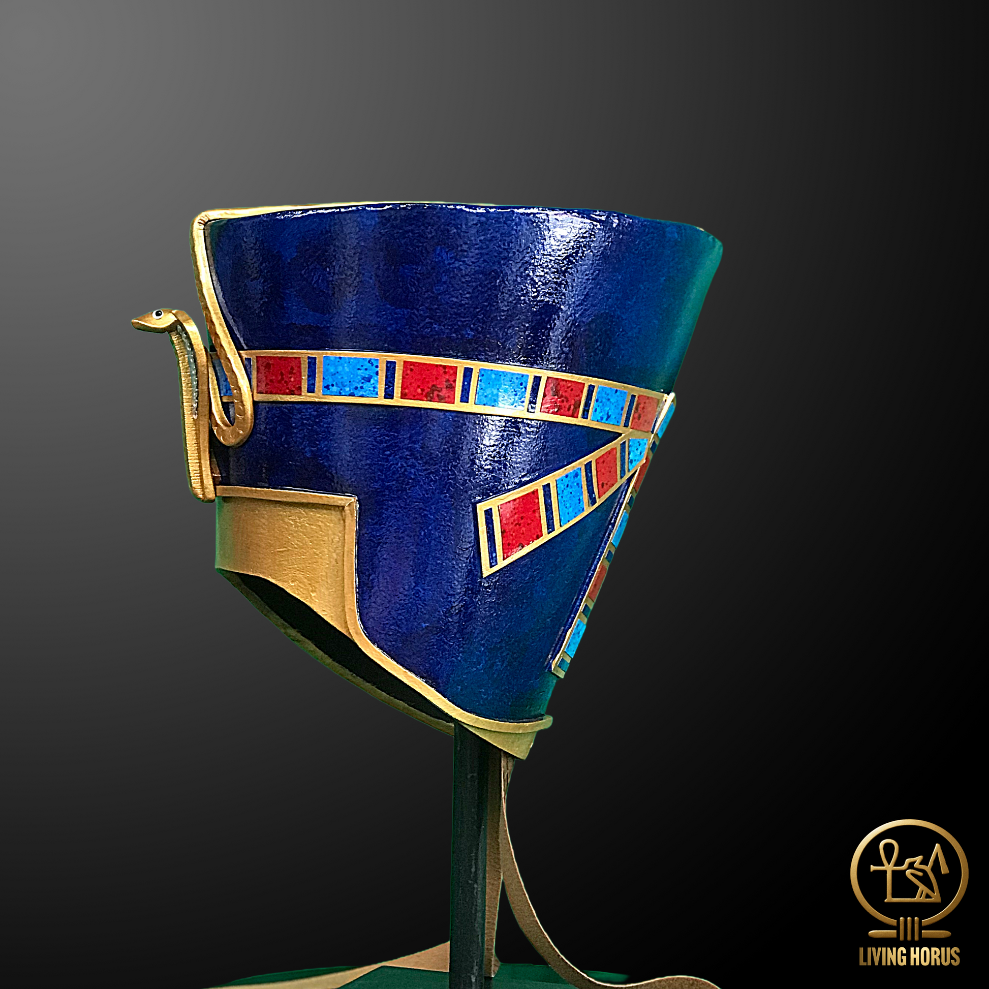 The famous blue flat top crown worn by the timeless beauty, Queen Nefertiti, Great Royal Wife of the 18th dynasty pharaoh, Akhenaten. She was made famous by her bust, now in Berlin's Neues Museum. The bust is one of the most copied works of ancient Egypt. It was attributed to the sculptor Thutmose, and it was found in his workshop.