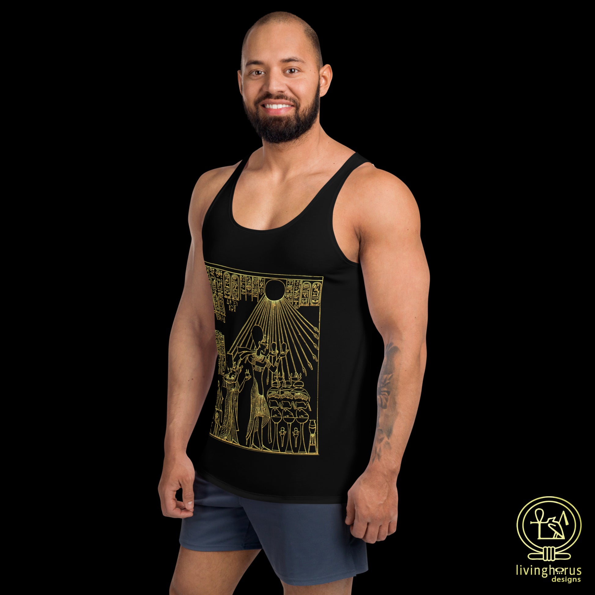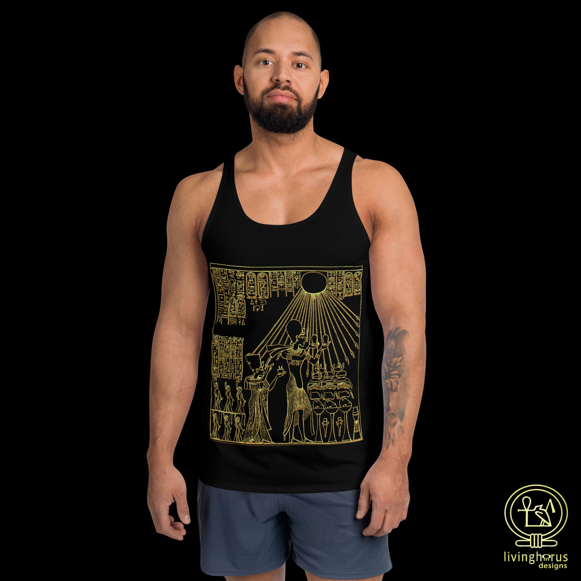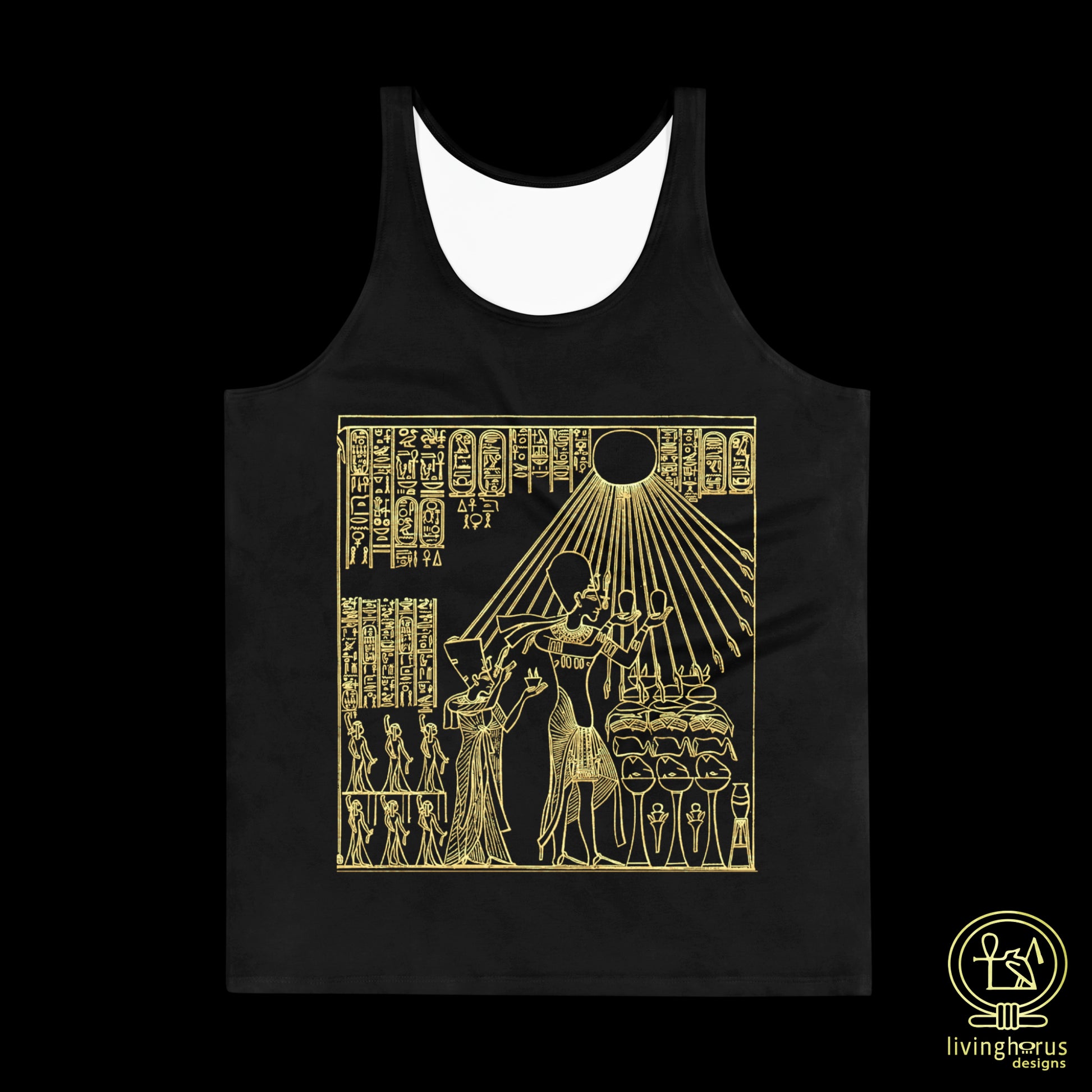 Elevate your style with the Living Horus Designs Egyptian Akhenaten & Nefertiti Tank Top featuring a captivating design inspired by the ancient art of Egypt. This tank top showcases a stunning depiction of Pharaoh Akhenaten and Queen Nefertiti offering to the Aten, rendered in gold against a deep black backdrop. The artwork, inspired by the Amarna Period, captures the elegance and mystique of ancient Egyptian royalty.