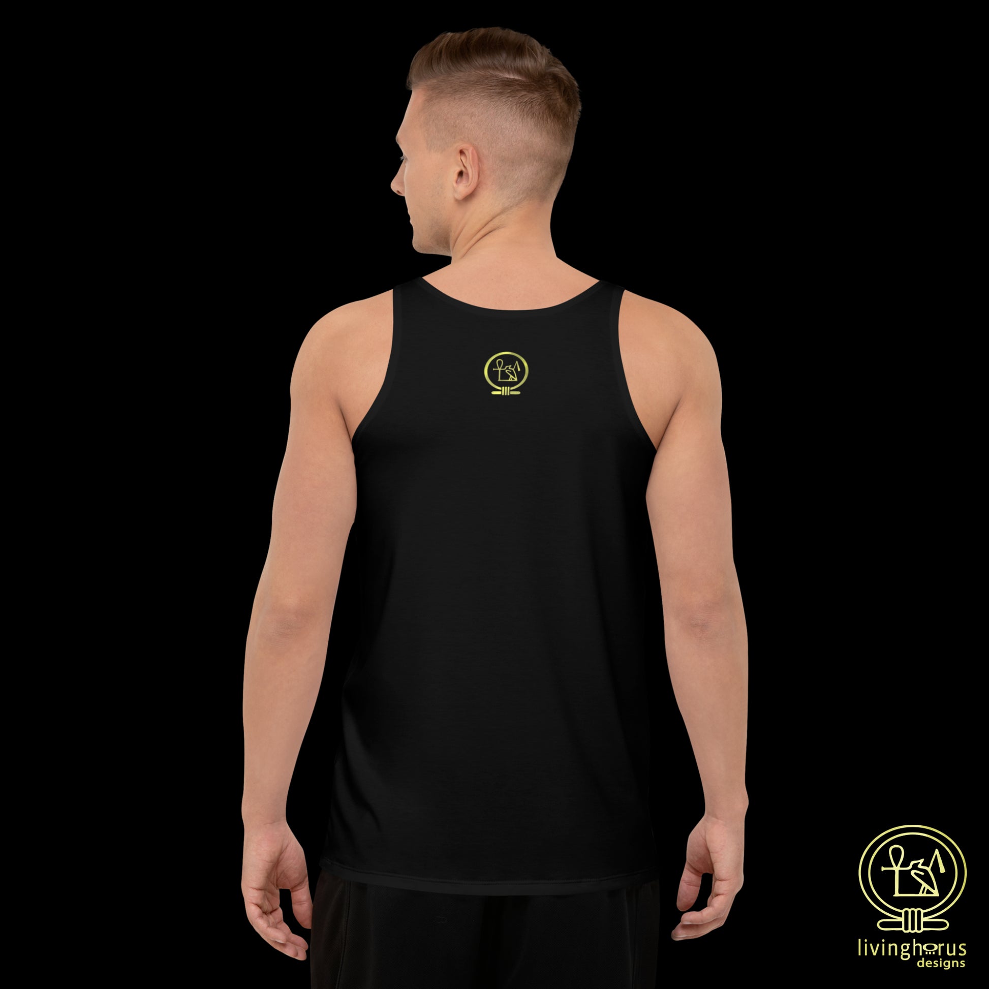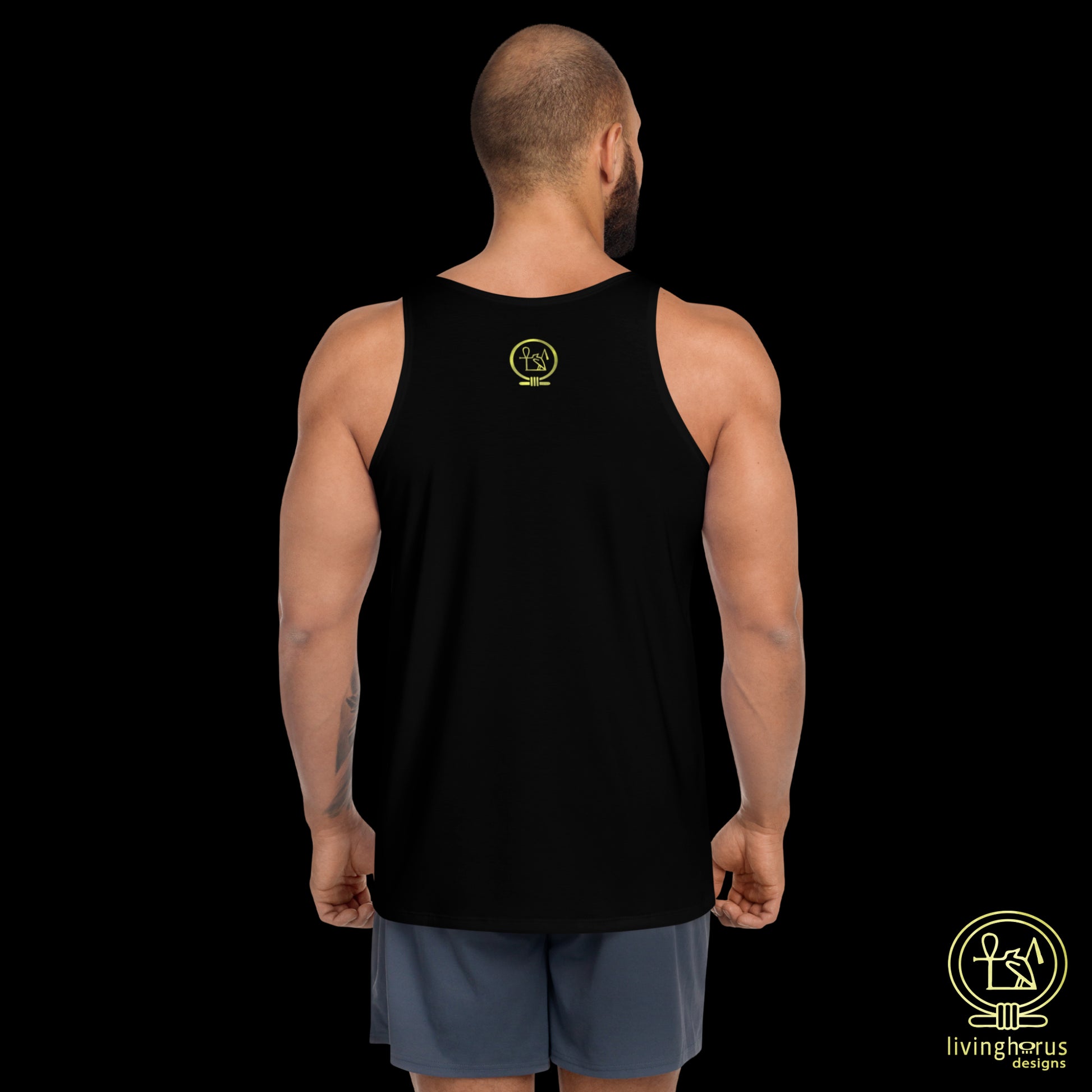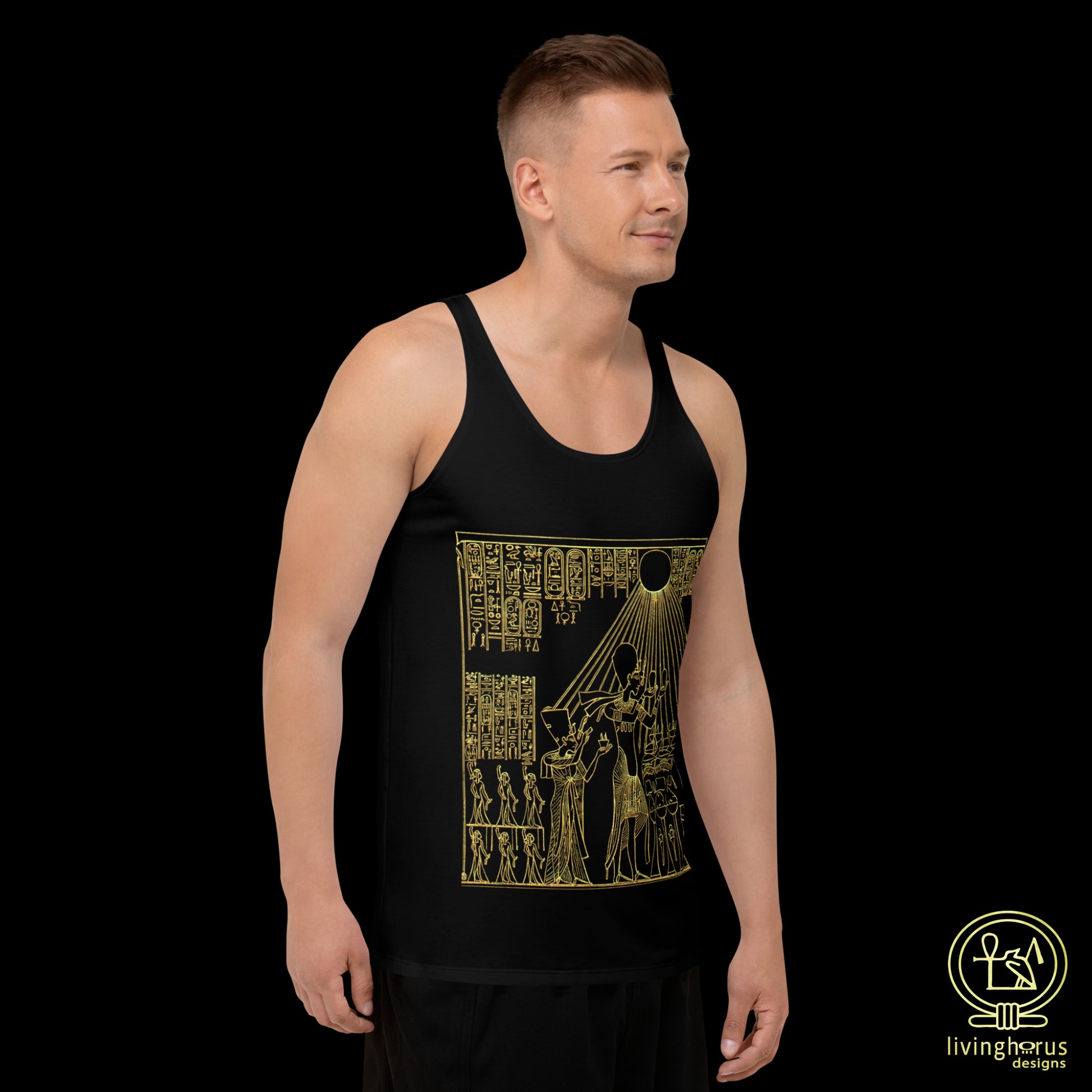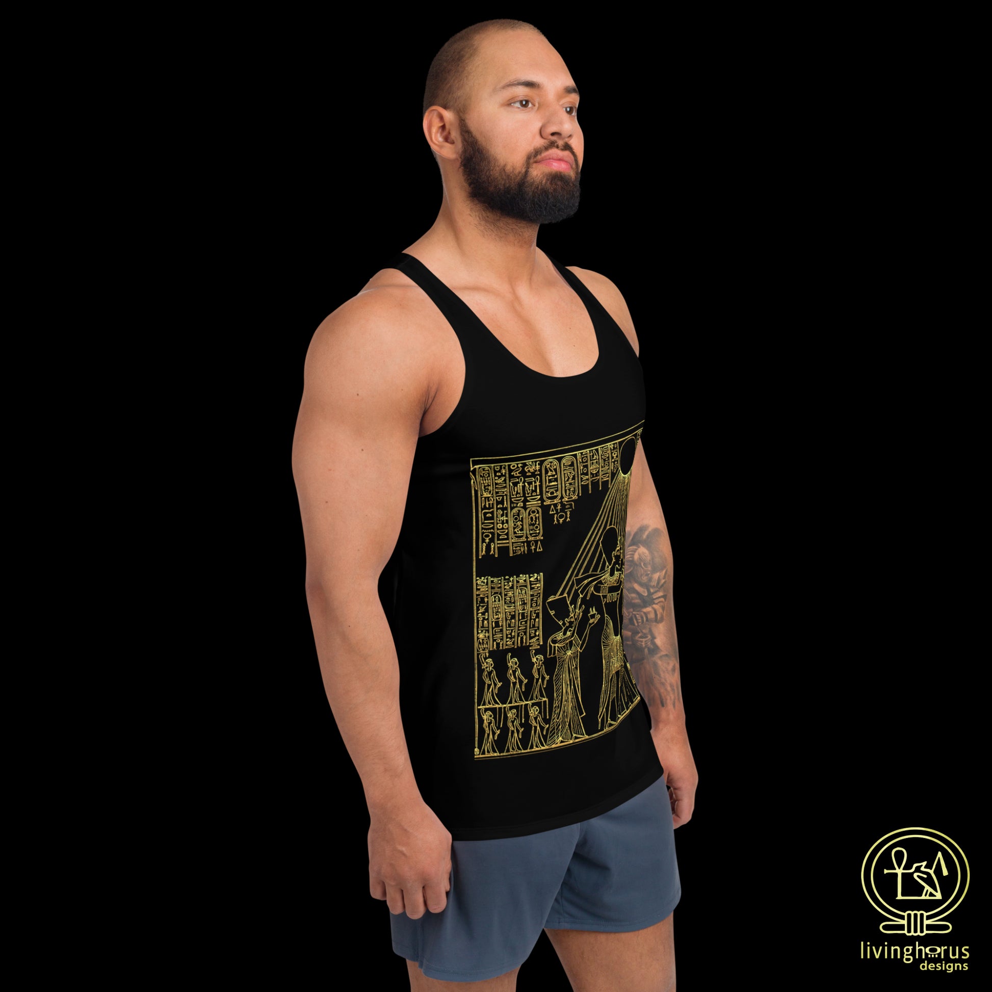 Elevate your style with the Living Horus Designs Egyptian Akhenaten & Nefertiti Tank Top featuring a captivating design inspired by the ancient art of Egypt. This tank top showcases a stunning depiction of Pharaoh Akhenaten and Queen Nefertiti offering to the Aten, rendered in gold against a deep black backdrop. The artwork, inspired by the Amarna Period, captures the elegance and mystique of ancient Egyptian royalty.