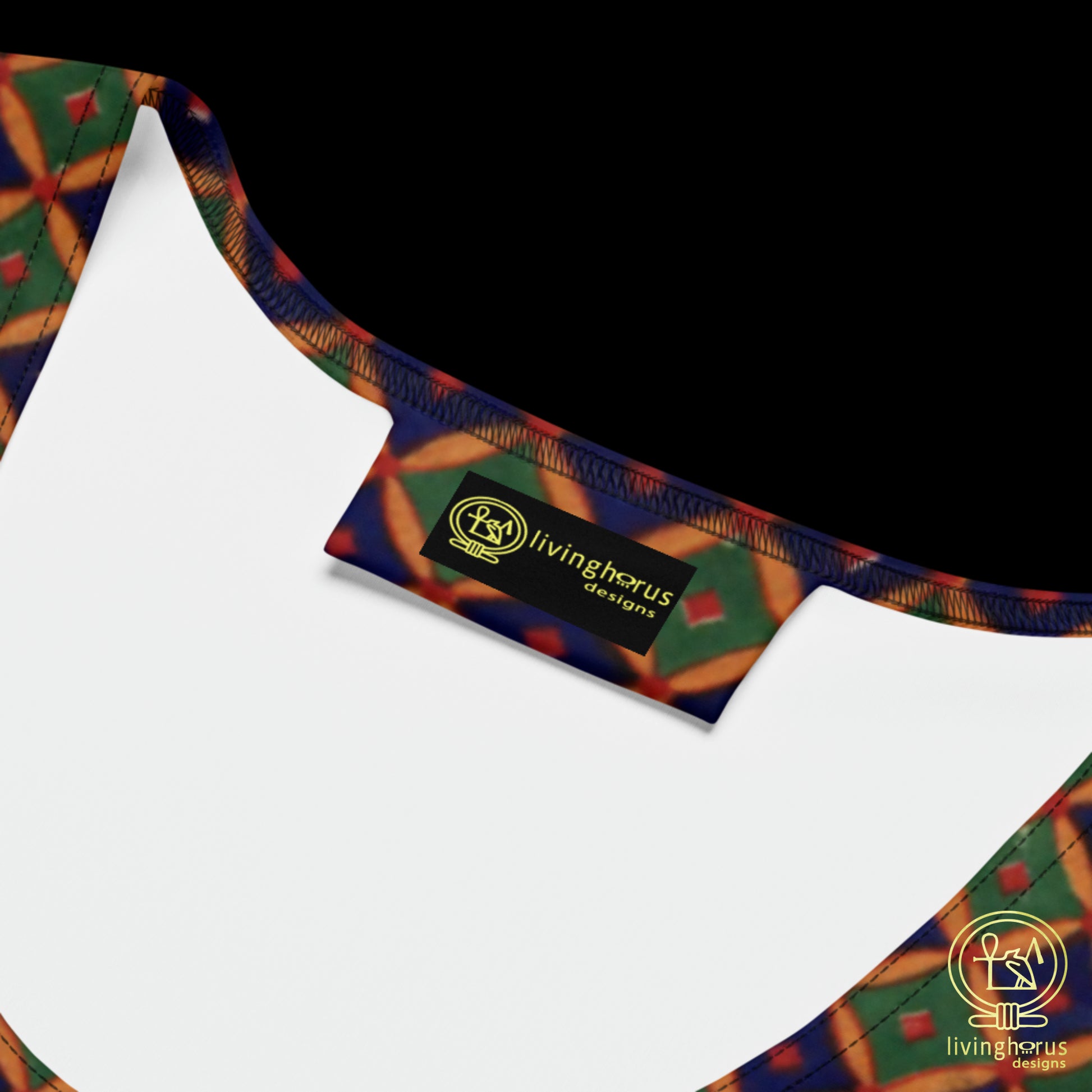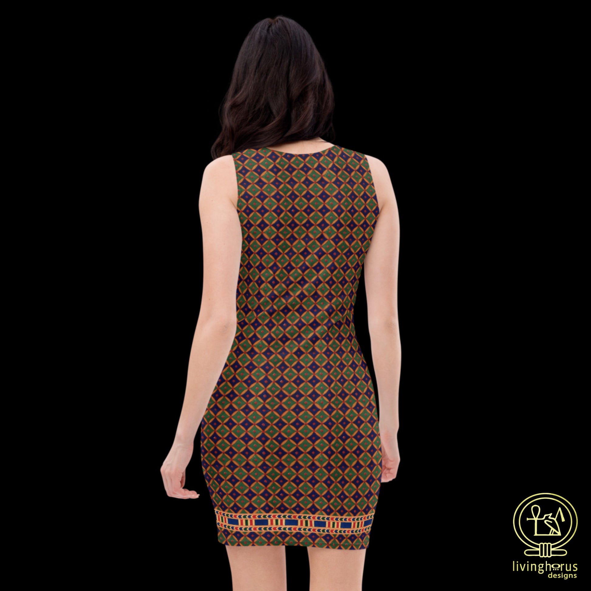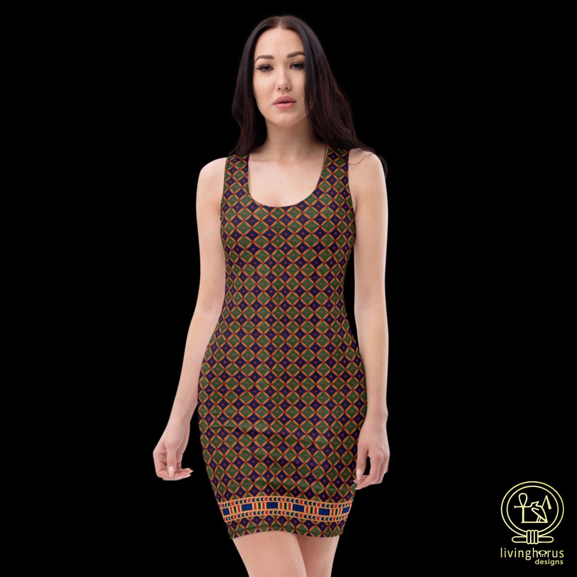 Dress to impress with this fitted ancient Egyptian Terracotta patterned bodycon dress! With a design based on a border decoration popular in Egyptian palaces and homes, the soft fabric and flared skirt give it an elegant twist that brings out the intricate design with a beautiful vibrancy.