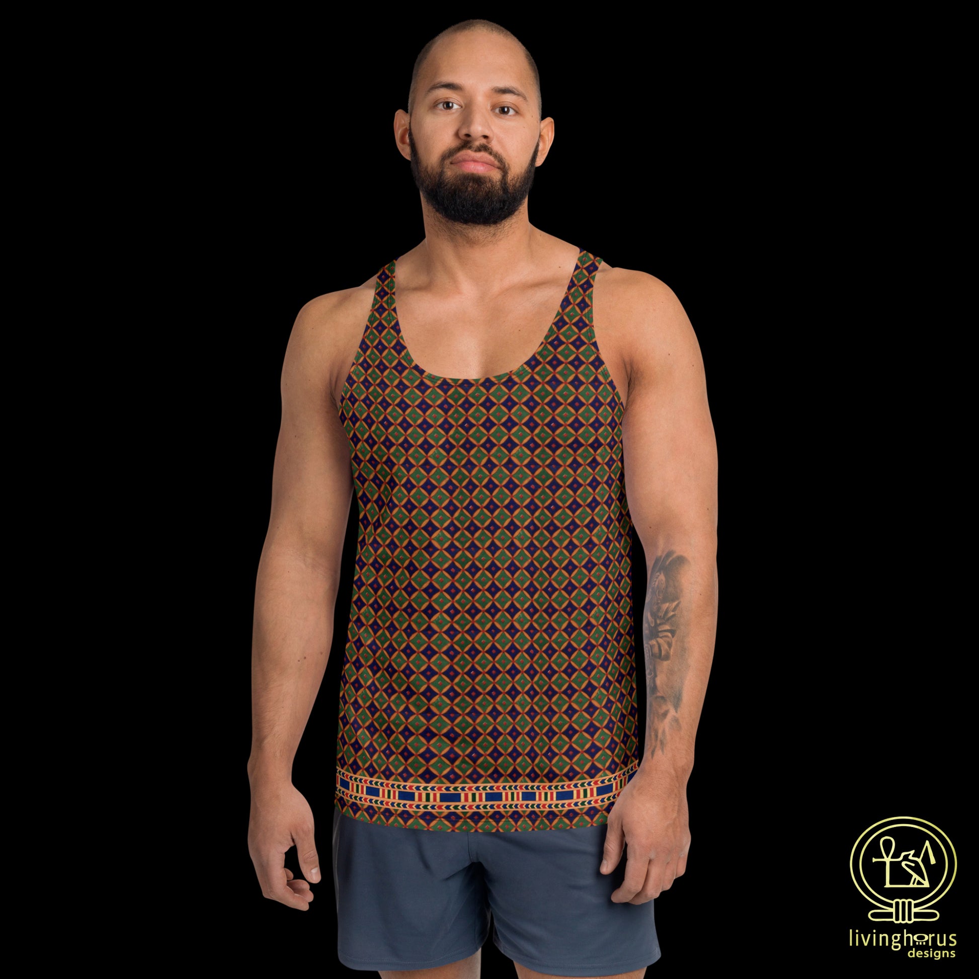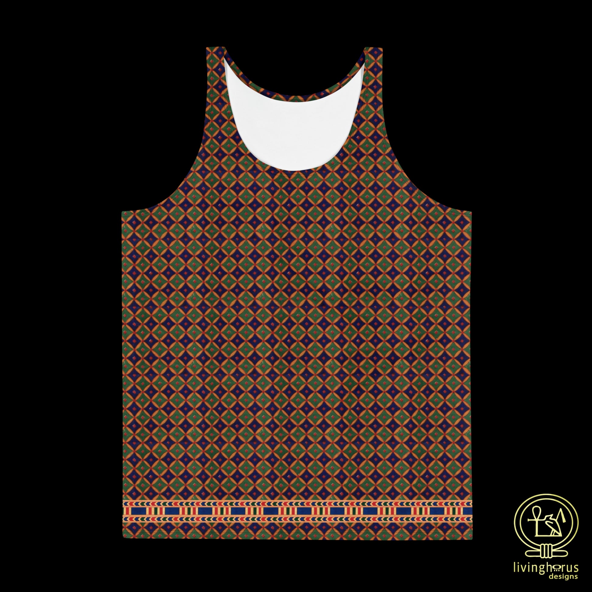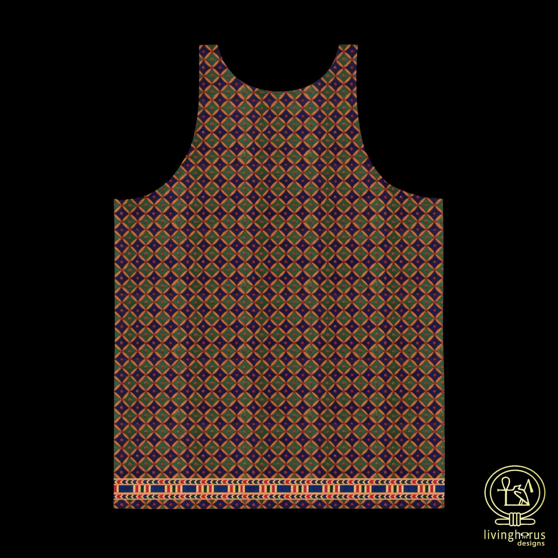Embrace the mystique of the Gods with this Living Horus Designs Egyptian Blue Green Diamond Pattern Tank Top. This unisex tank top offers comfort and style, making it a must-have addition to your wardrobe for an effortlessly chic look this summer. This tank top has everything you could possibly need – vibrant colours, soft material, and a relaxed fit that will make you look fabulous!
