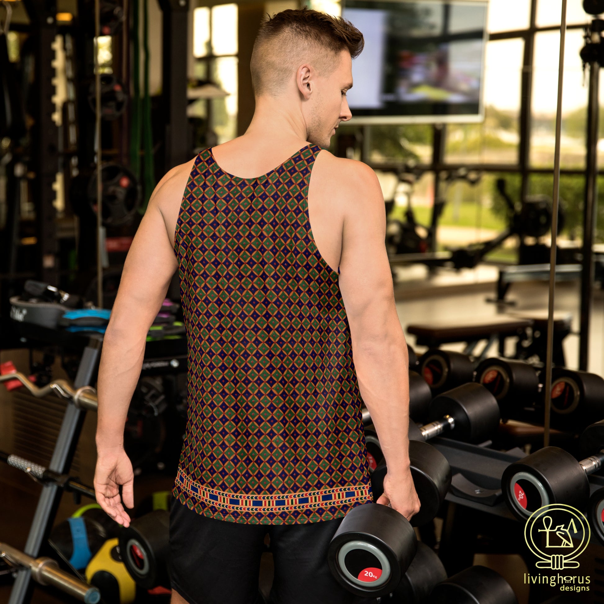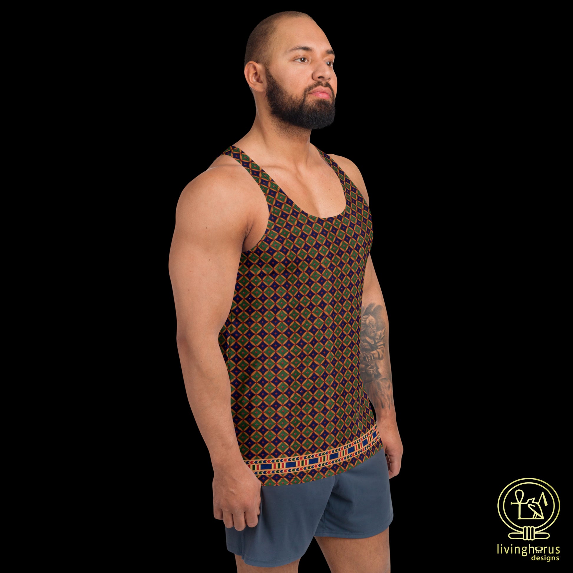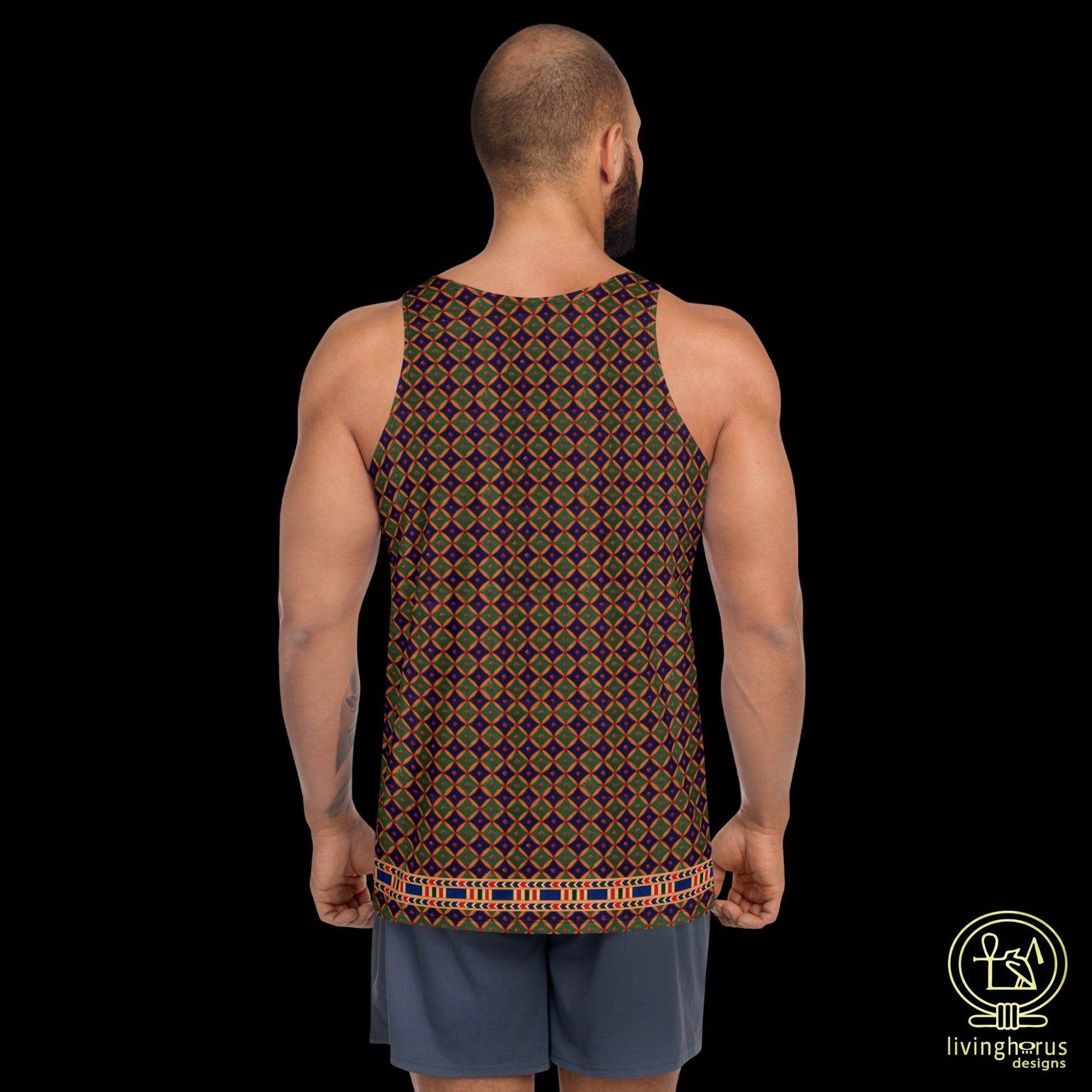 Embrace the mystique of the Gods with this Living Horus Designs Egyptian Blue Green Diamond Pattern Tank Top. This unisex tank top offers comfort and style, making it a must-have addition to your wardrobe for an effortlessly chic look this summer. This tank top has everything you could possibly need – vibrant colours, soft material, and a relaxed fit that will make you look fabulous!