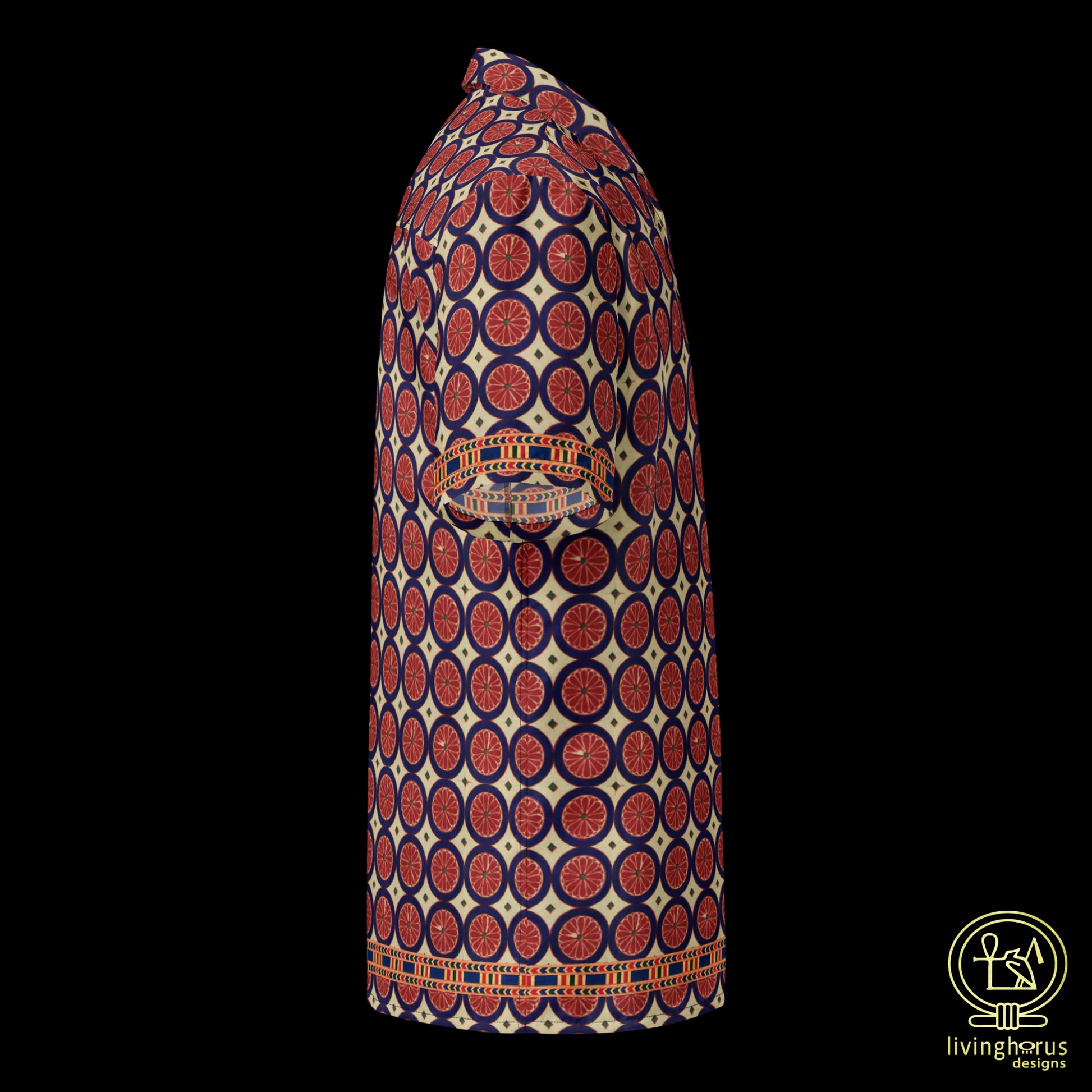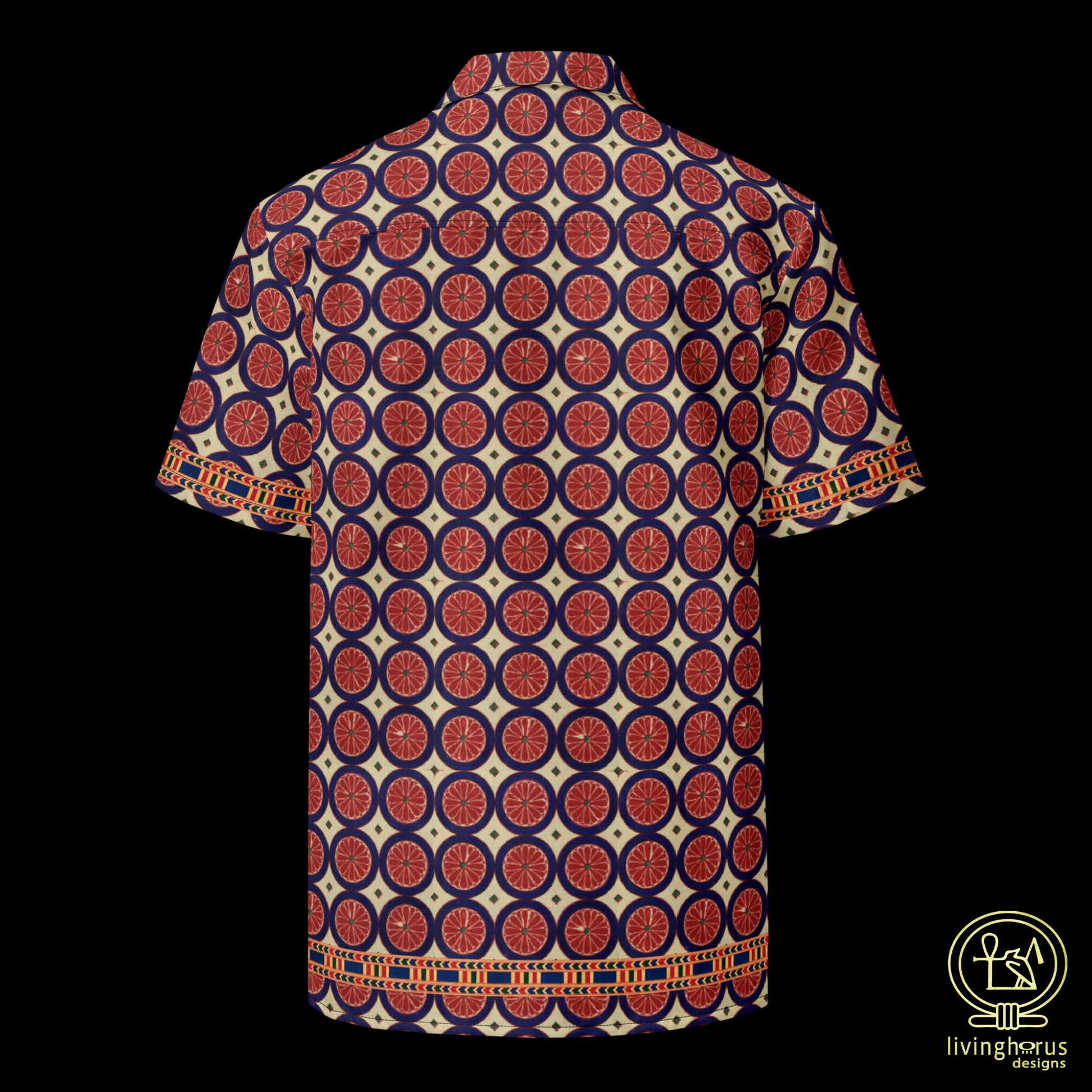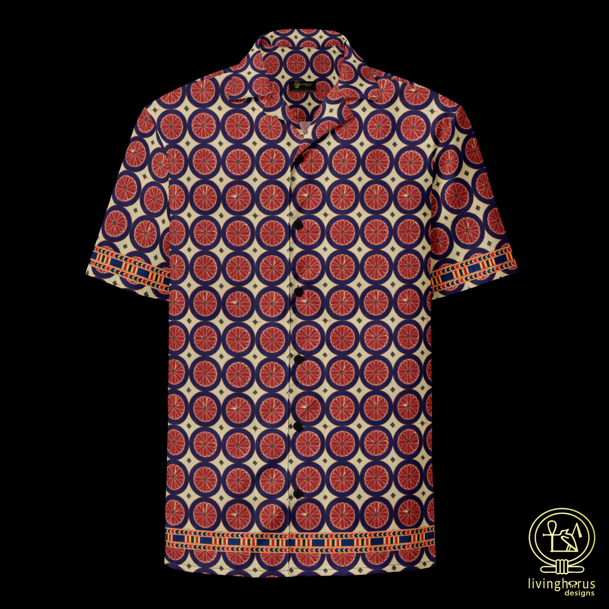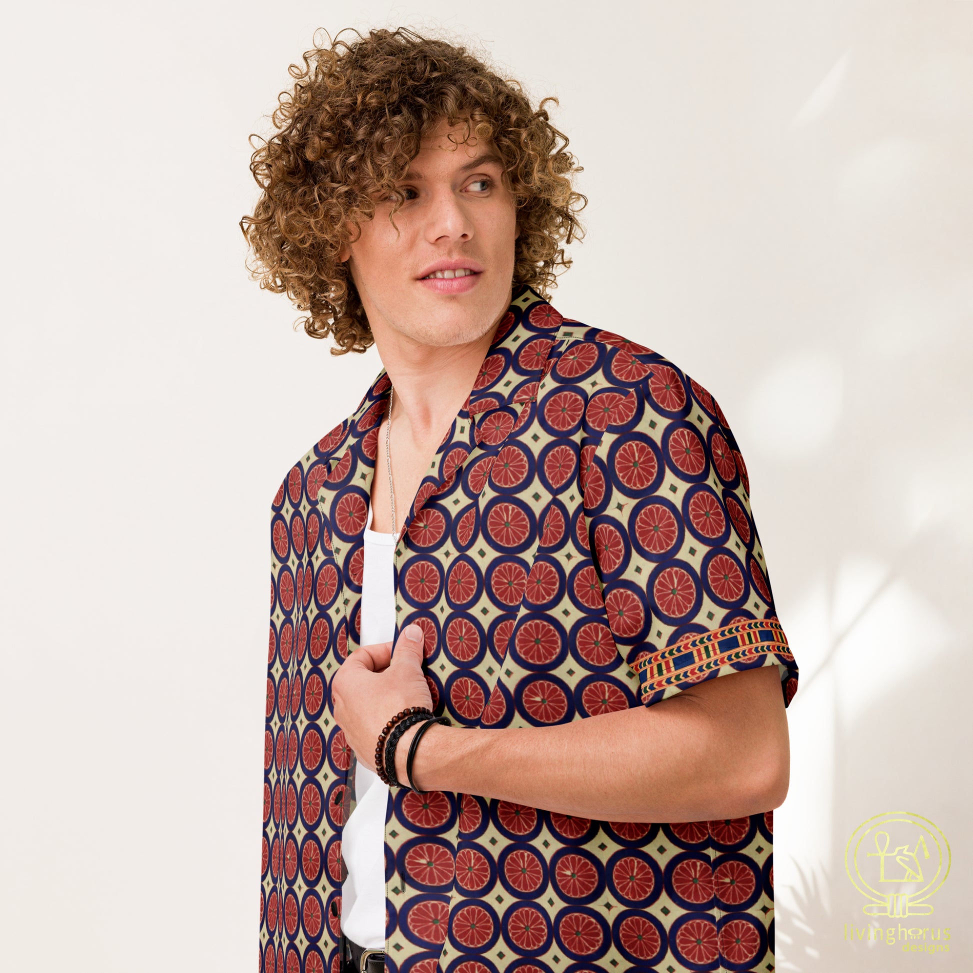 Introducing the Ancient Egyptian Citrus Pattern Hawaiian Shirt, a vibrant fusion of Hawaiian style and ancient Egyptian allure by Living Horus Designs. Inspired by the intricate wall paintings found in the majestic palaces and timeless tombs of Egypt, this shirt boasts a captivating pattern that breathes new life into centuries-old artistry.