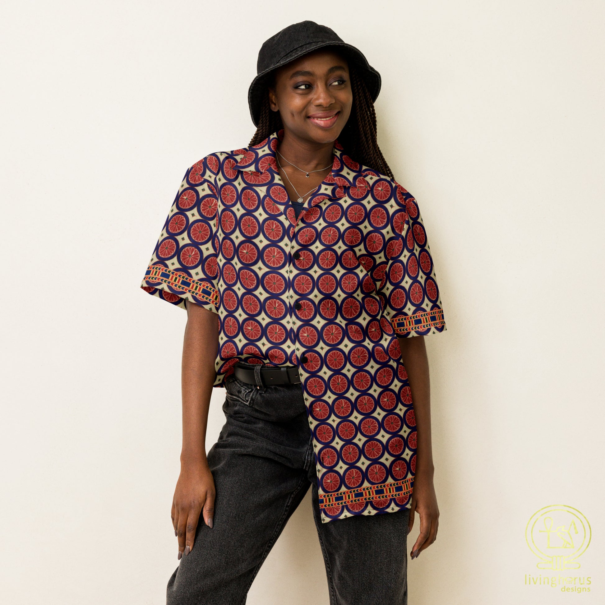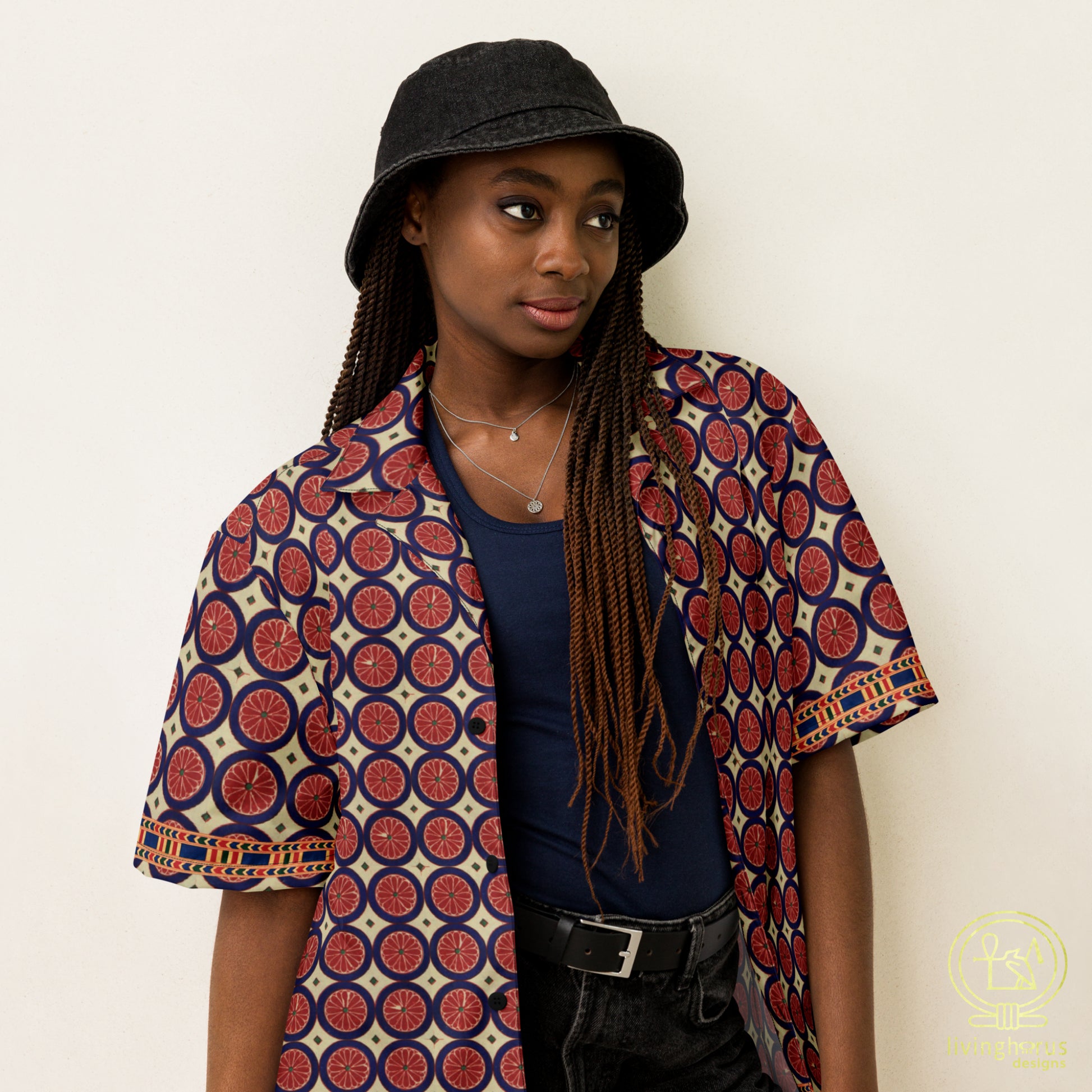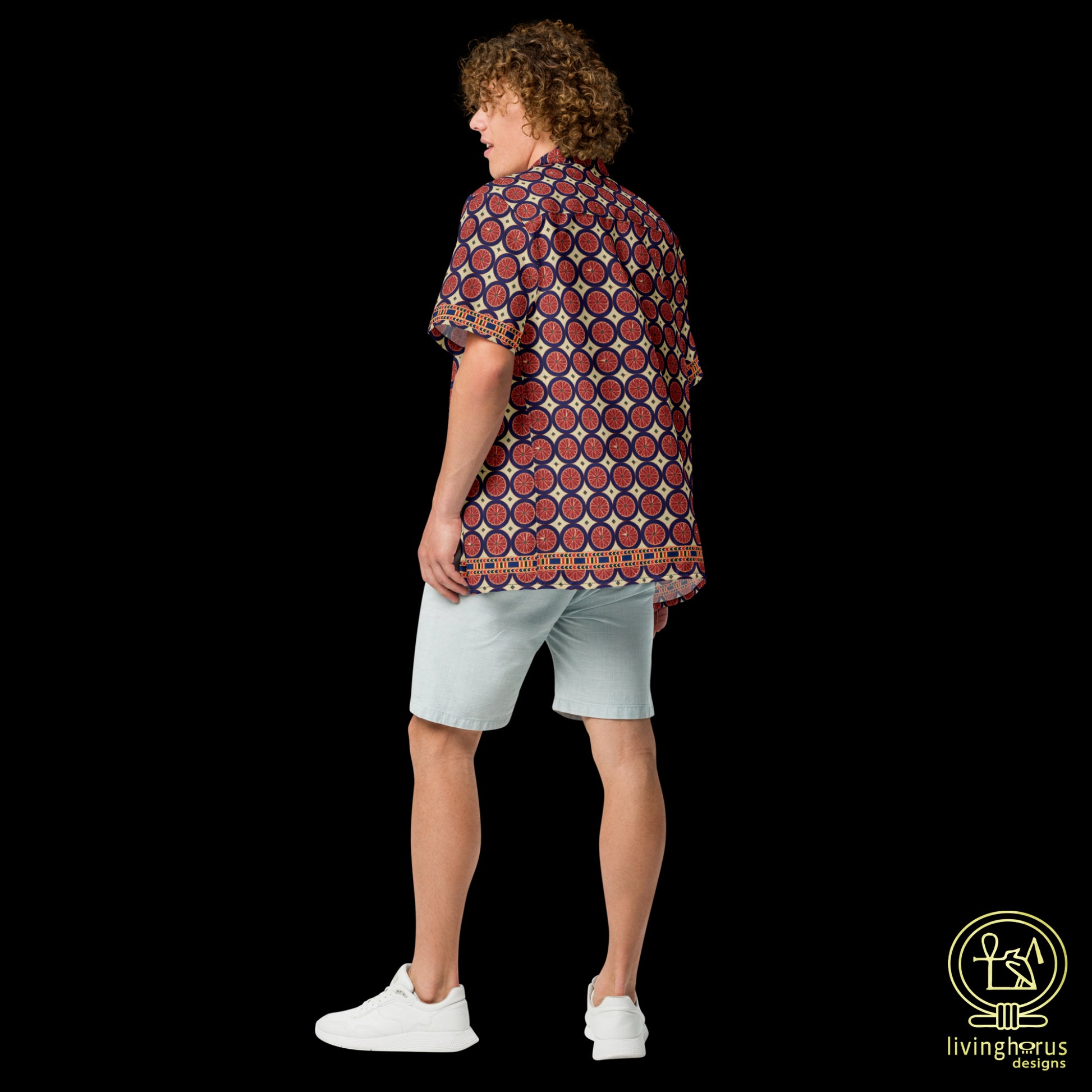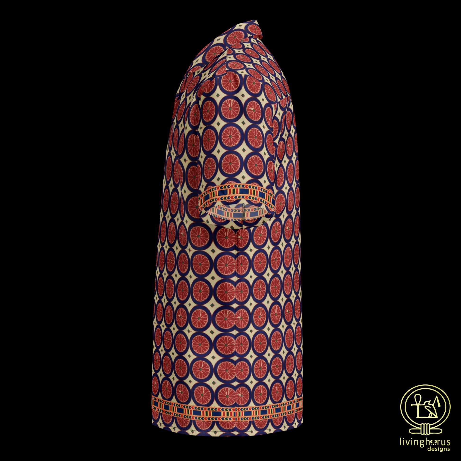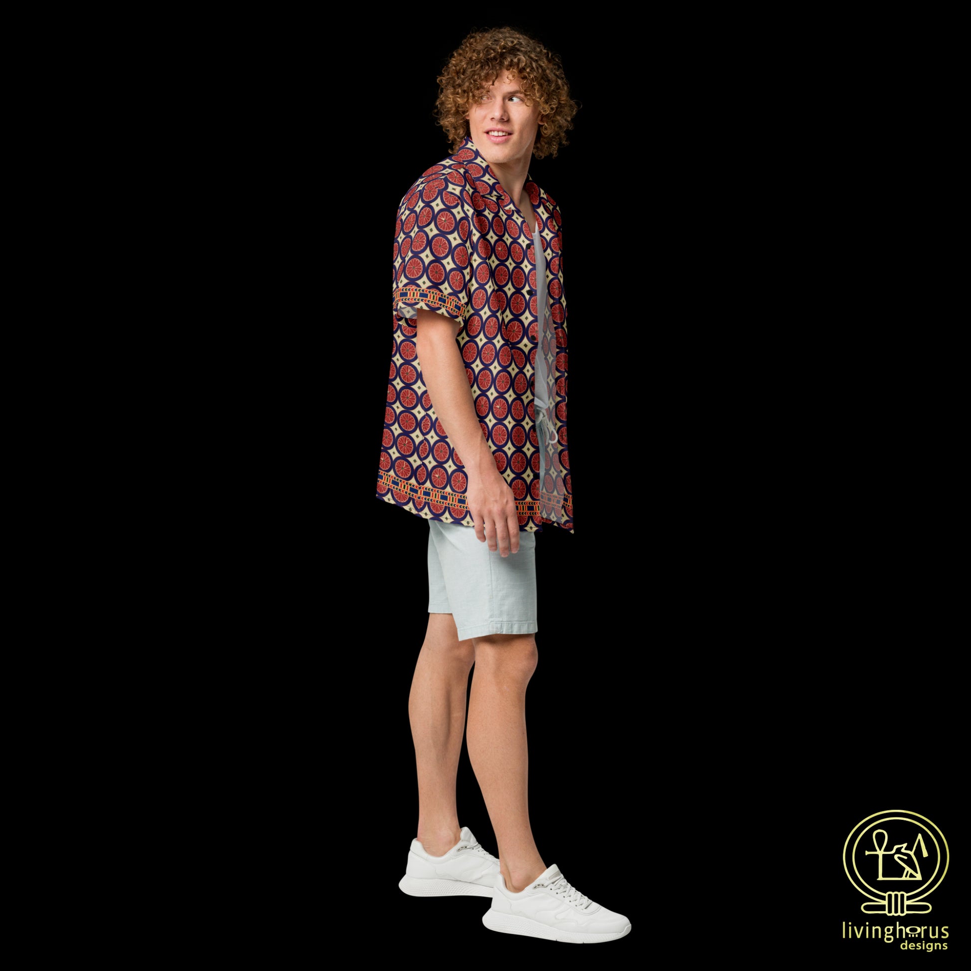 Introducing the Ancient Egyptian Citrus Pattern Hawaiian Shirt, a vibrant fusion of Hawaiian style and ancient Egyptian allure by Living Horus Designs. Inspired by the intricate wall paintings found in the majestic palaces and timeless tombs of Egypt, this shirt boasts a captivating pattern that breathes new life into centuries-old artistry.