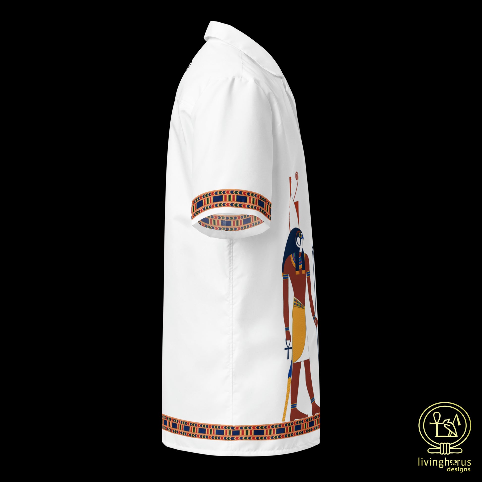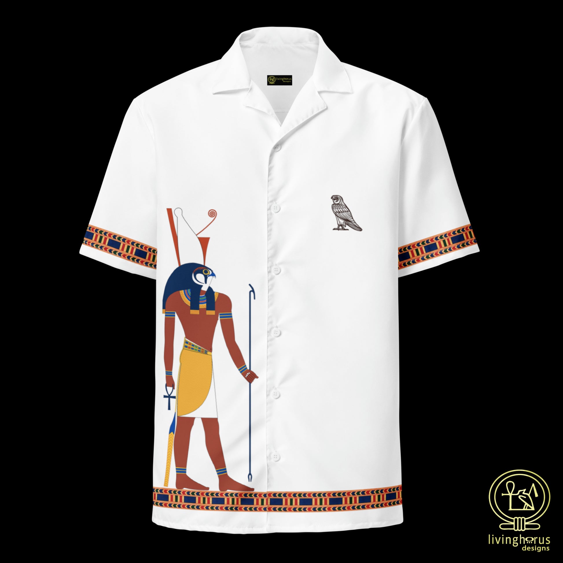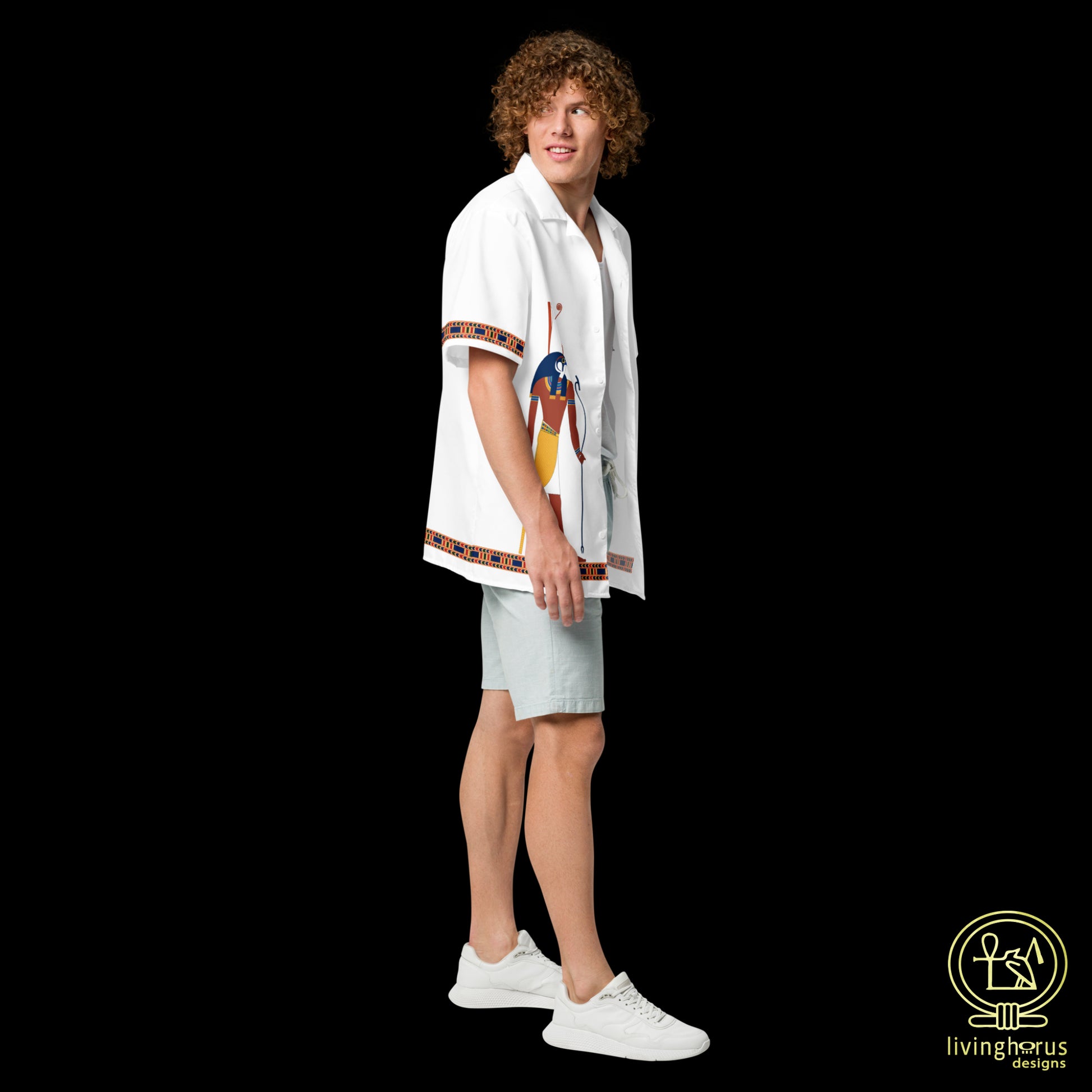 Introducing the Living Horus Designs stunning Egyptian God Horus Hawaiian Shirt, the perfect addition to your summer wardrobe. Crafted with care from recycled polyester, this shirt seamlessly blends sustainability with style. Available in both classic black and crisp white, it's designed to keep you cool and comfortable during scorching summer days.
