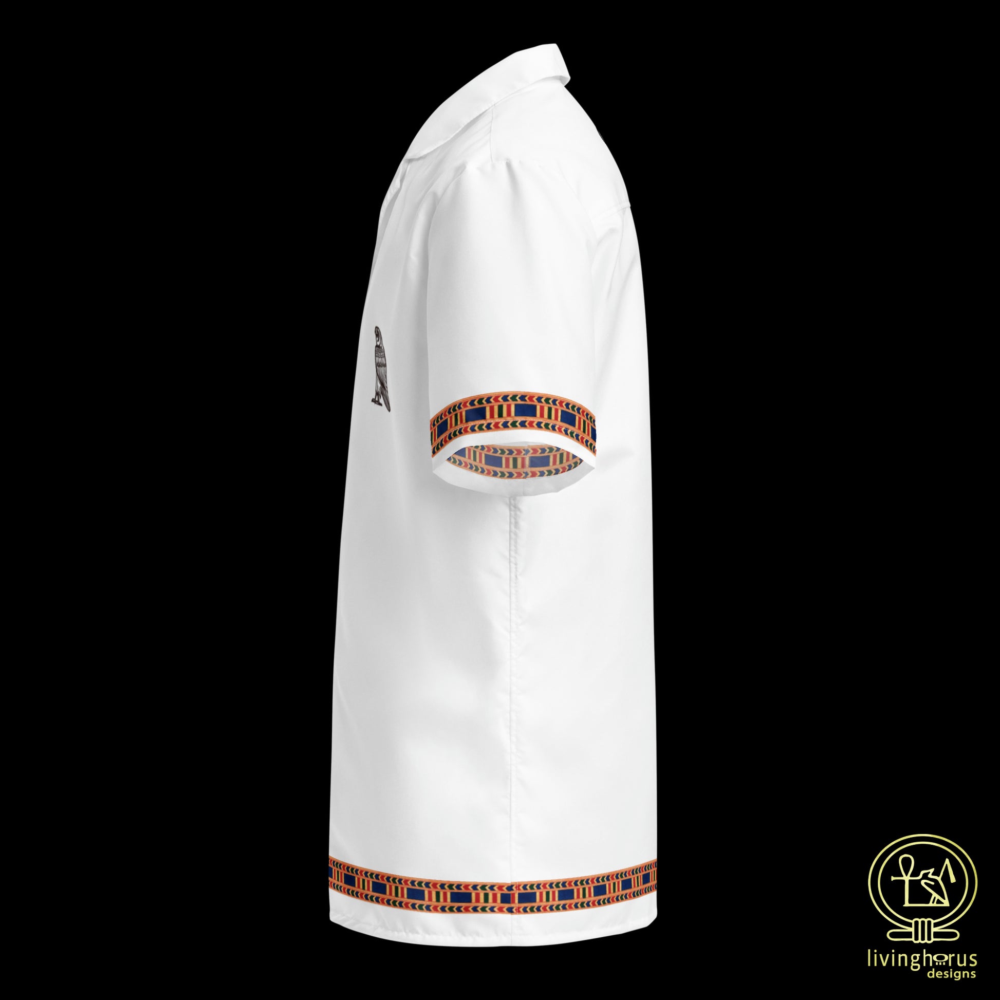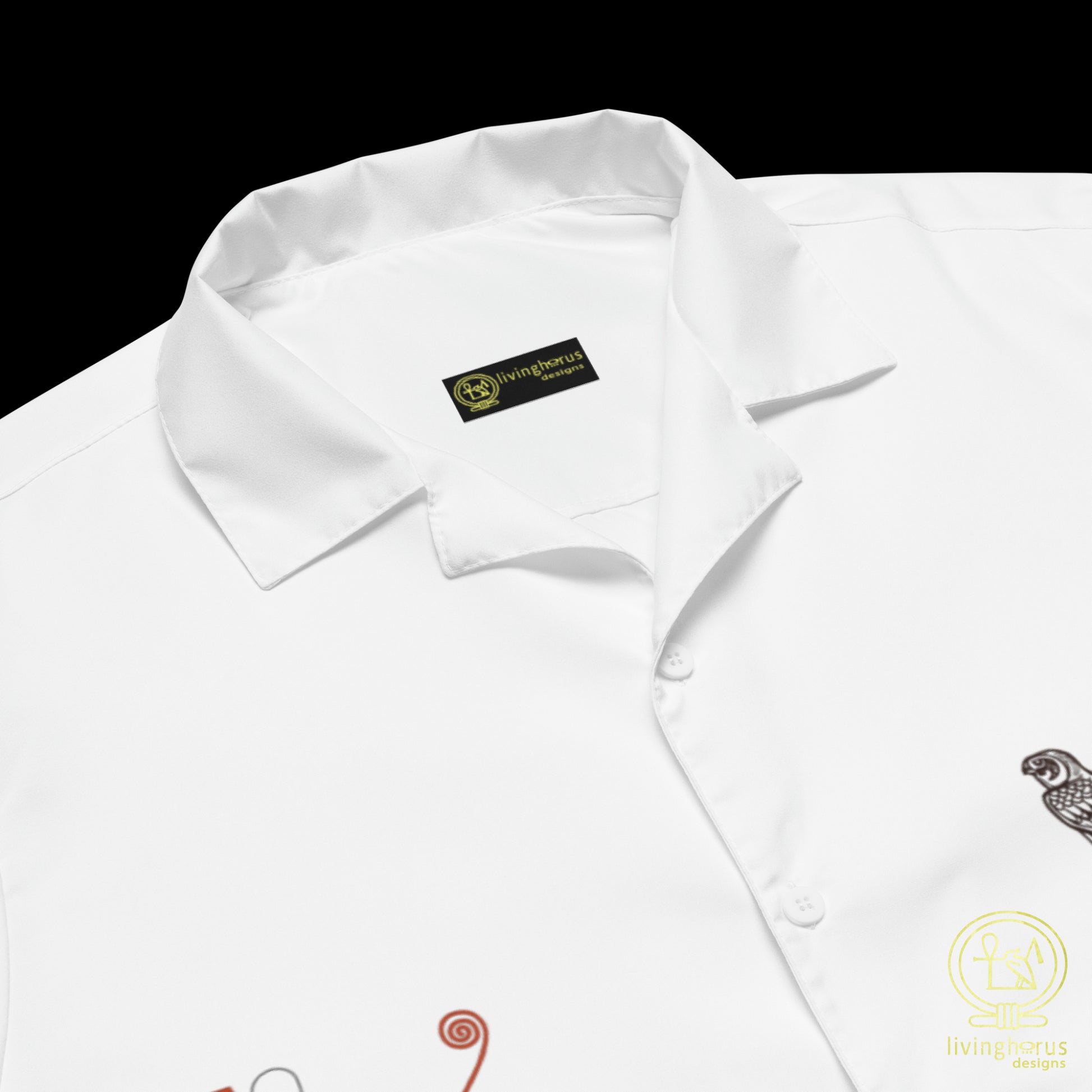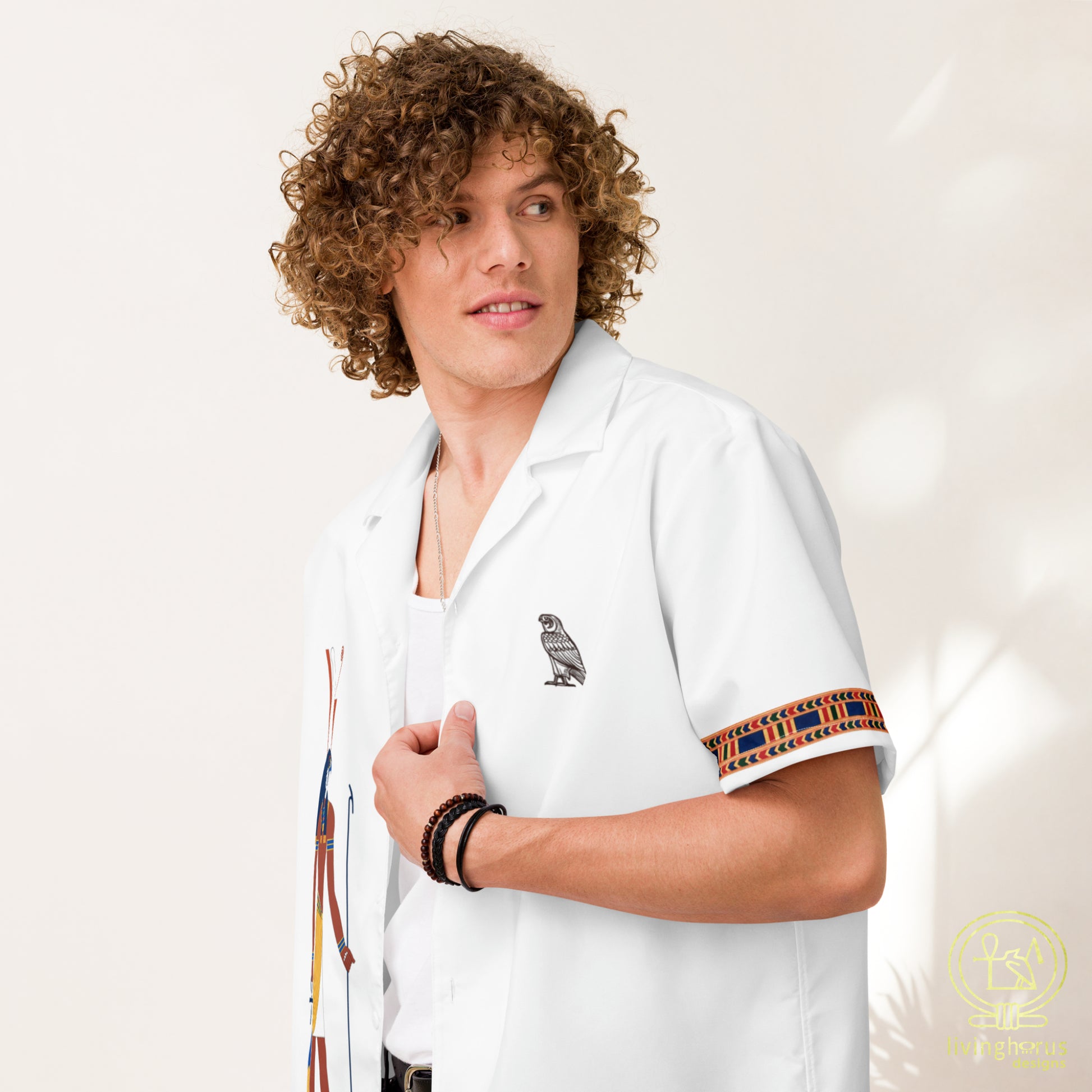 Introducing the Living Horus Designs stunning Egyptian God Horus Hawaiian Shirt, the perfect addition to your summer wardrobe. Crafted with care from recycled polyester, this shirt seamlessly blends sustainability with style. Available in both classic black and crisp white, it's designed to keep you cool and comfortable during scorching summer days.