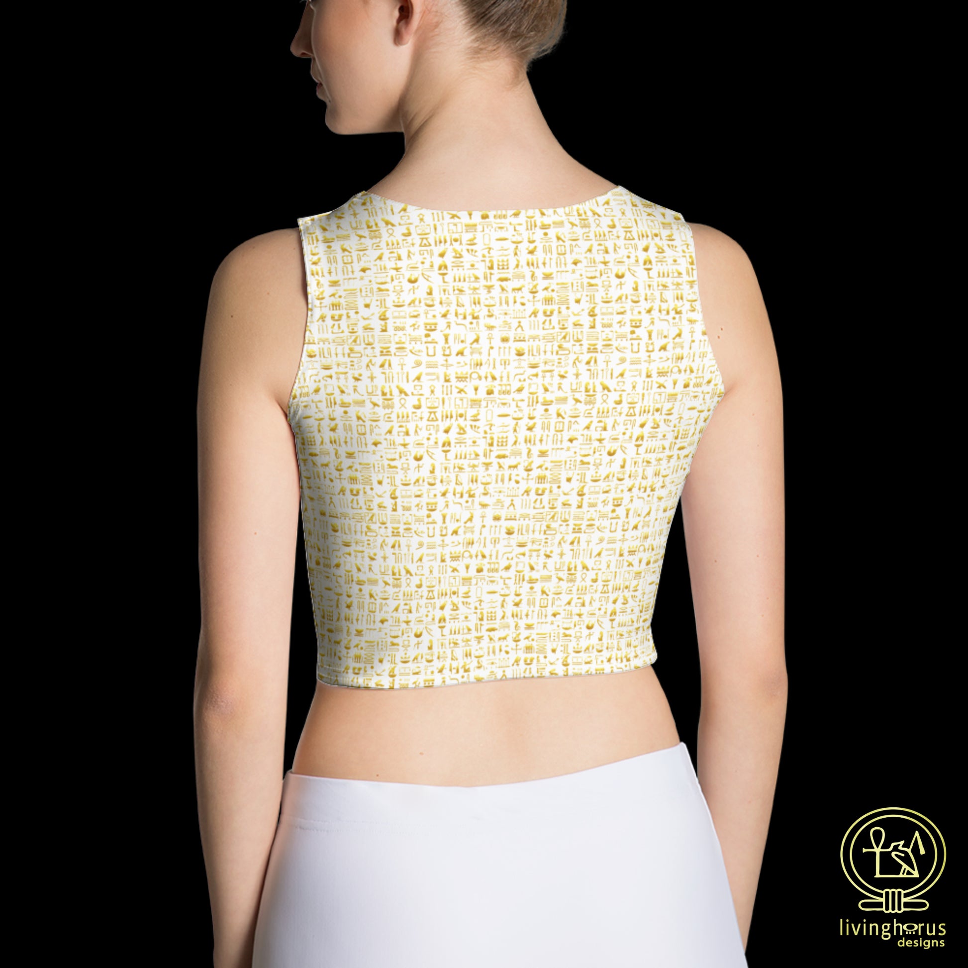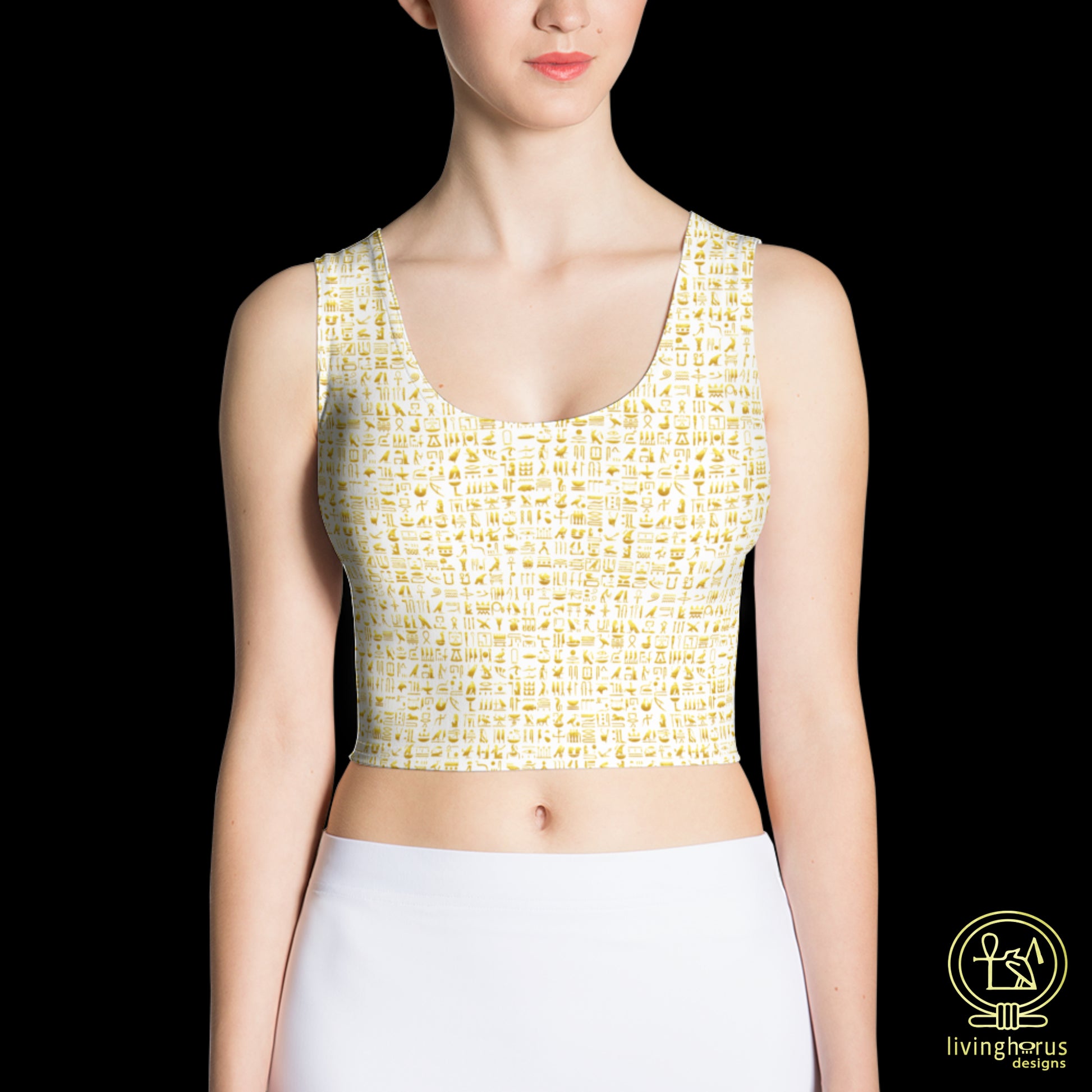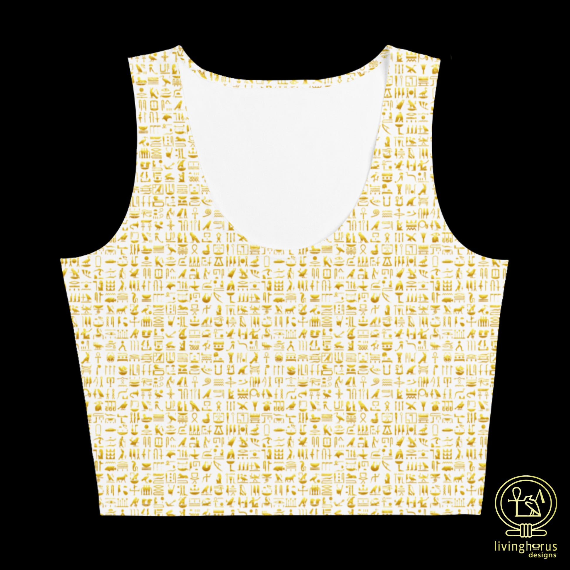 Unleash your inner goddess with the Living Horus Designs Egyptian Hieroglyph Crop Top. This striking piece features an all-over print inspired by ancient Egyptian hieroglyphs, bringing a touch of mysticism and timeless elegance to your wardrobe. Crafted from a premium polyester/spandex blend, the fabric offers a four-way stretch that moves with you, ensuring both comfort and a flattering fit.