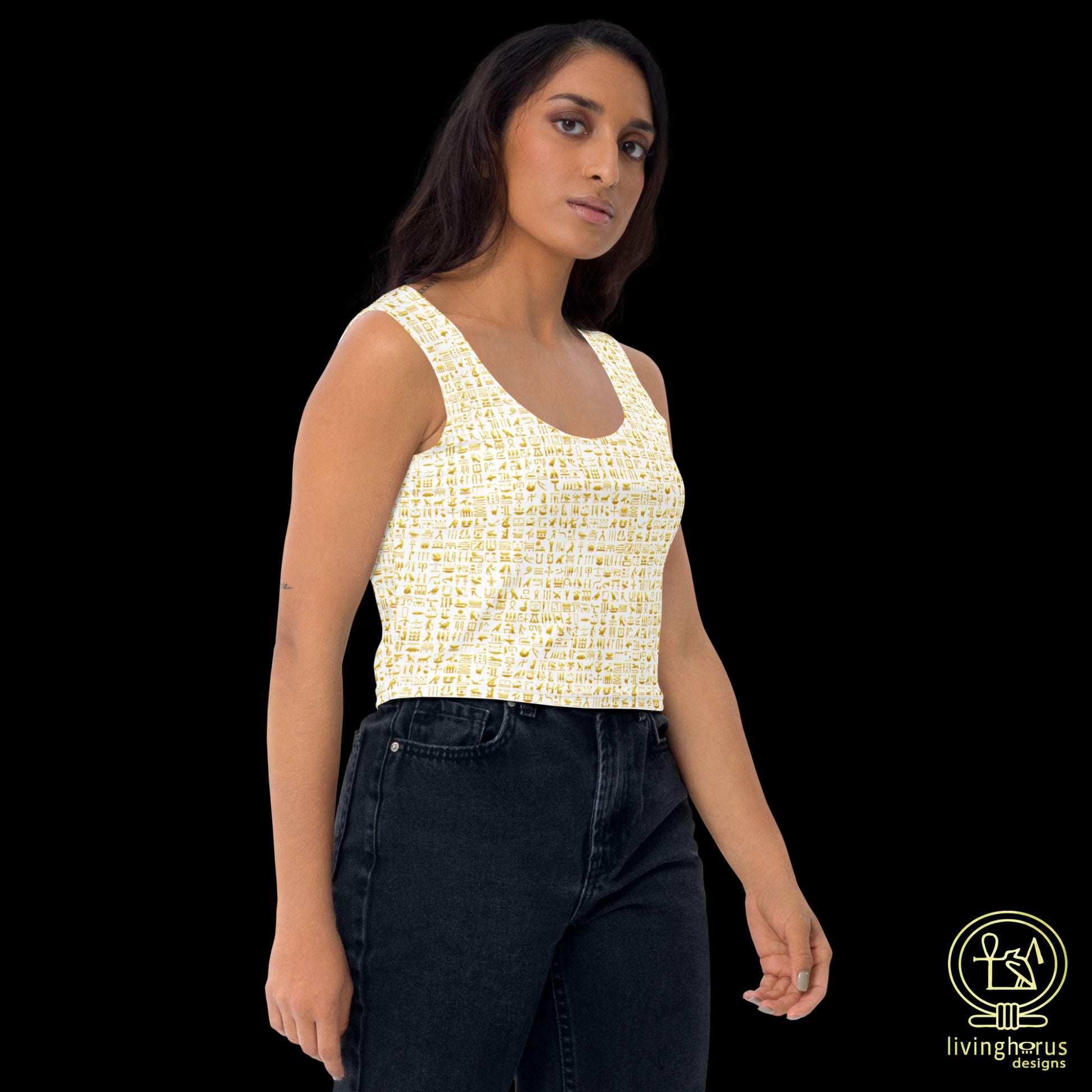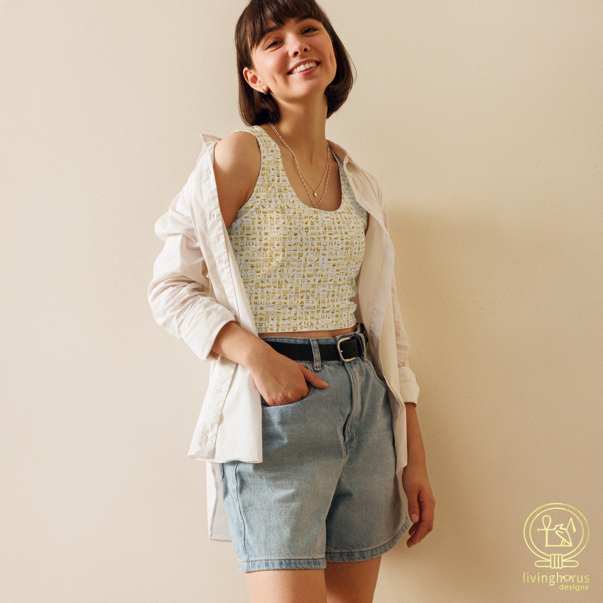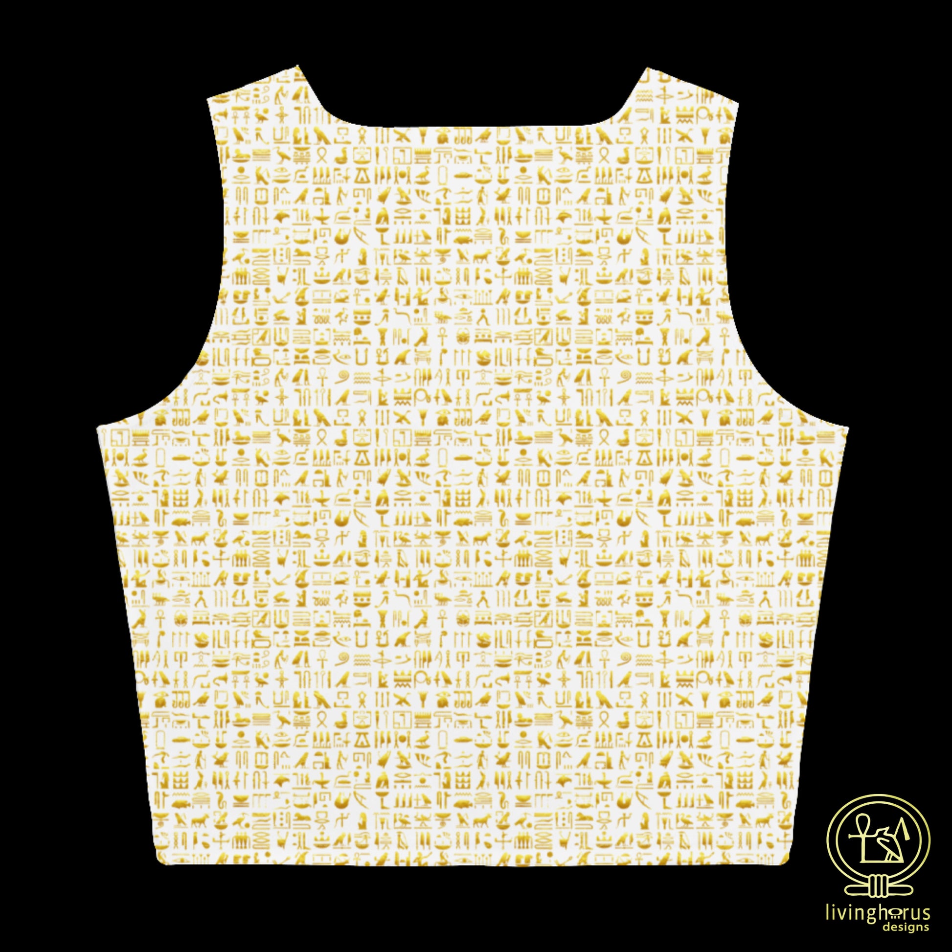 Unleash your inner goddess with the Living Horus Designs Egyptian Hieroglyph Crop Top. This striking piece features an all-over print inspired by ancient Egyptian hieroglyphs, bringing a touch of mysticism and timeless elegance to your wardrobe. Crafted from a premium polyester/spandex blend, the fabric offers a four-way stretch that moves with you, ensuring both comfort and a flattering fit.