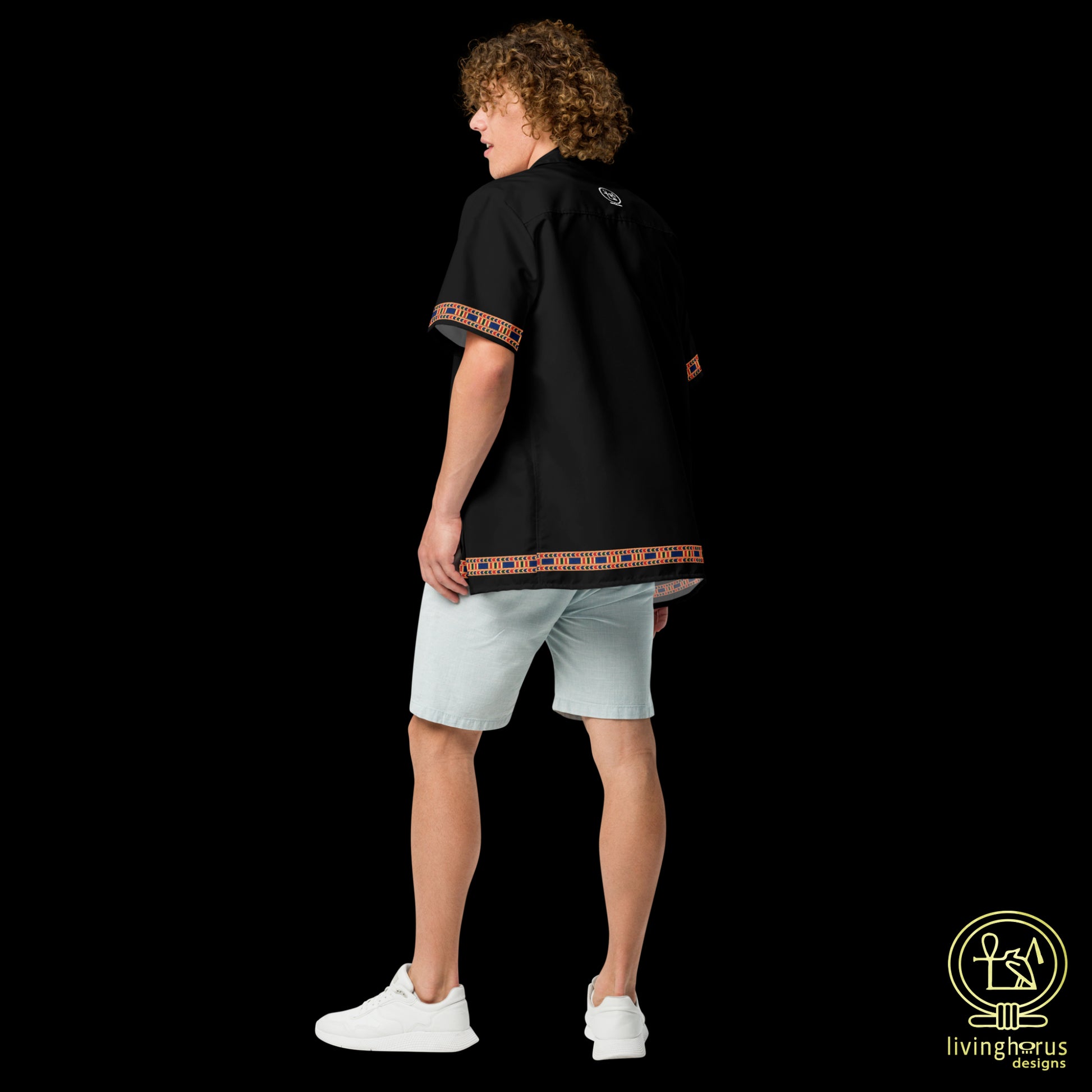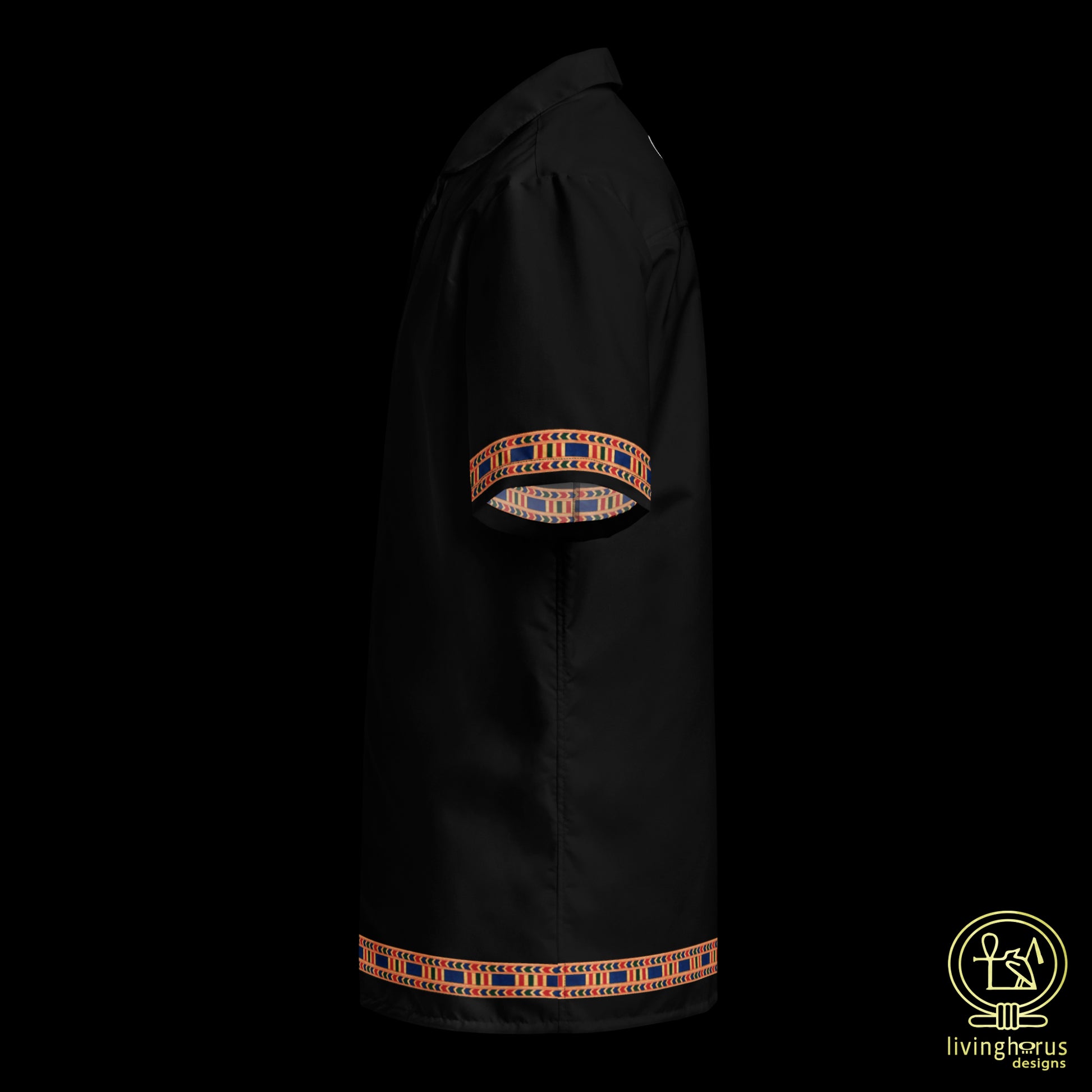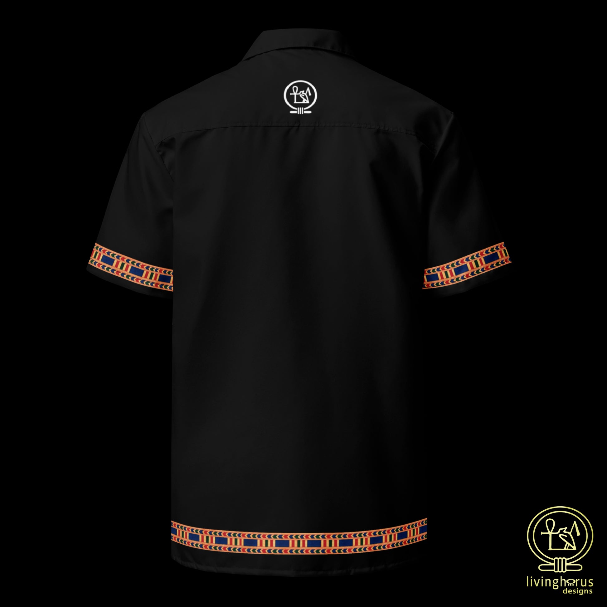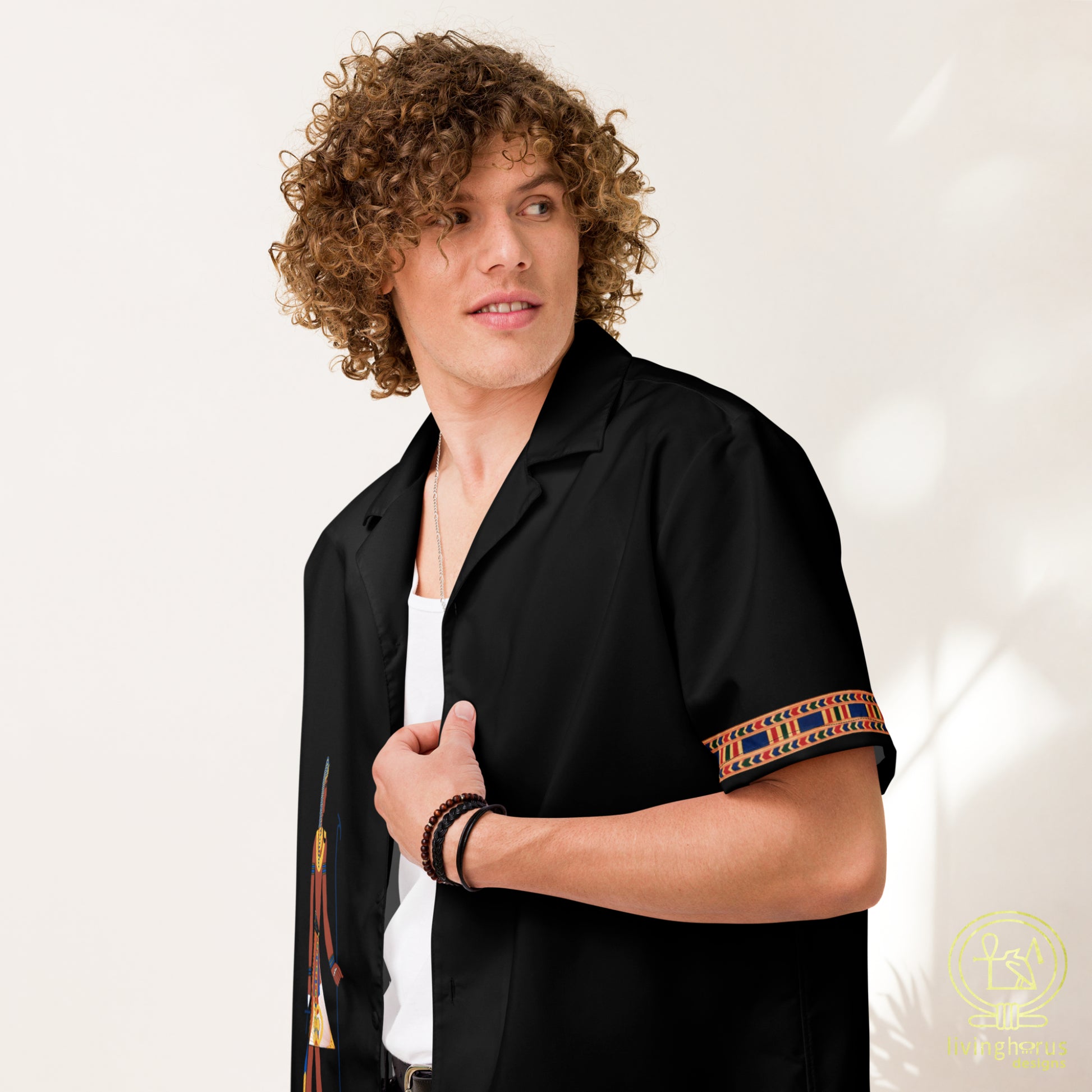 Introducing the Living Horus Designs stunning Ancient Egyptian Pharaoh Hawaiian Shirt, the perfect addition to your summer wardrobe. Crafted with care from recycled polyester, this shirt seamlessly blends sustainability with style. Available in both classic black and crisp white, it's designed to keep you cool and comfortable during scorching summer days.