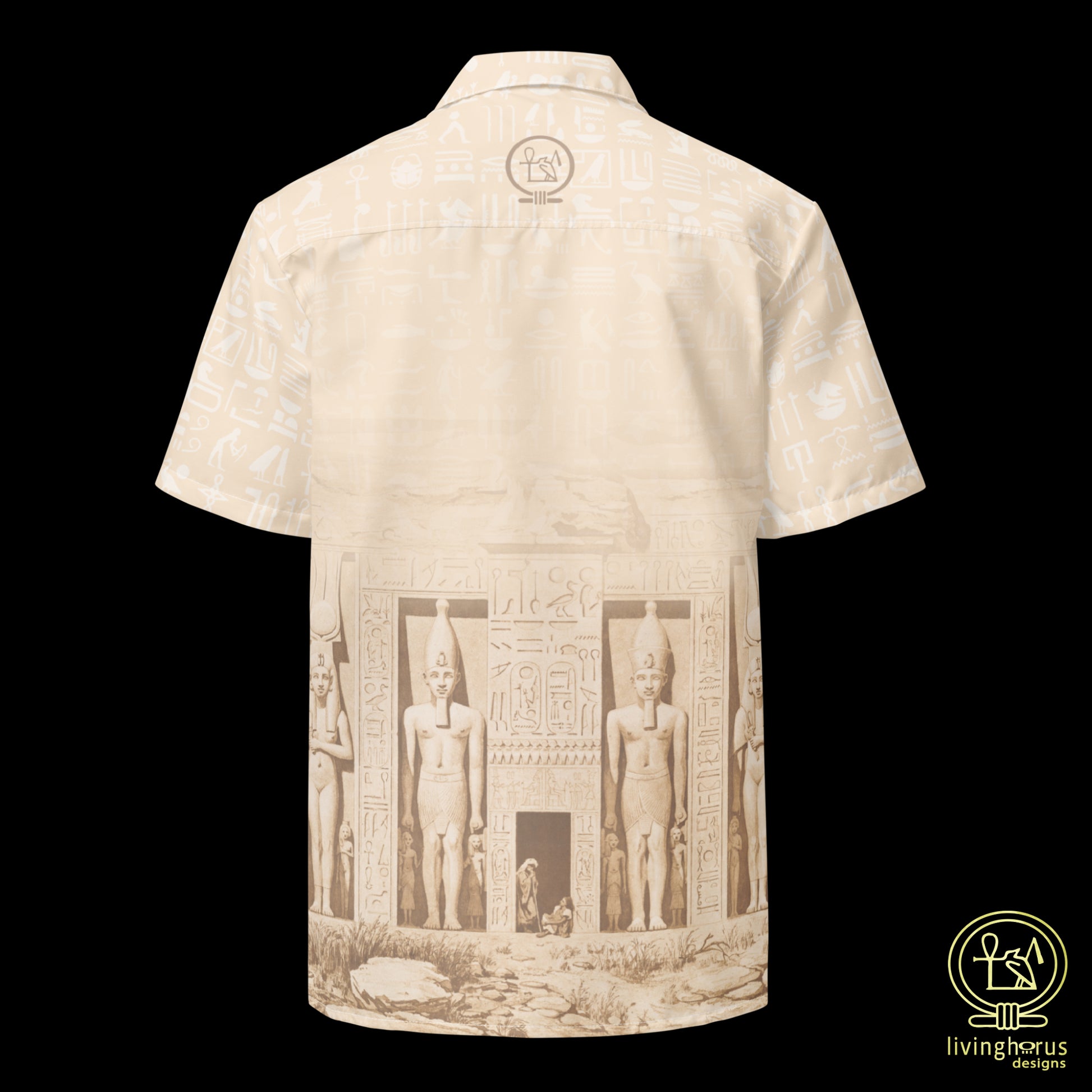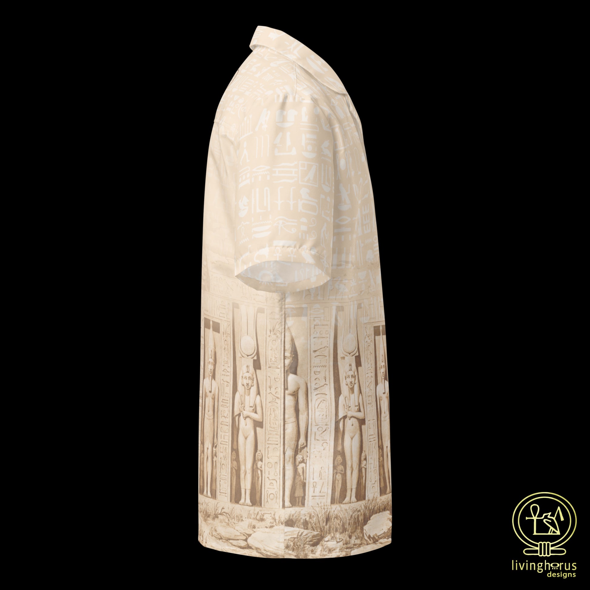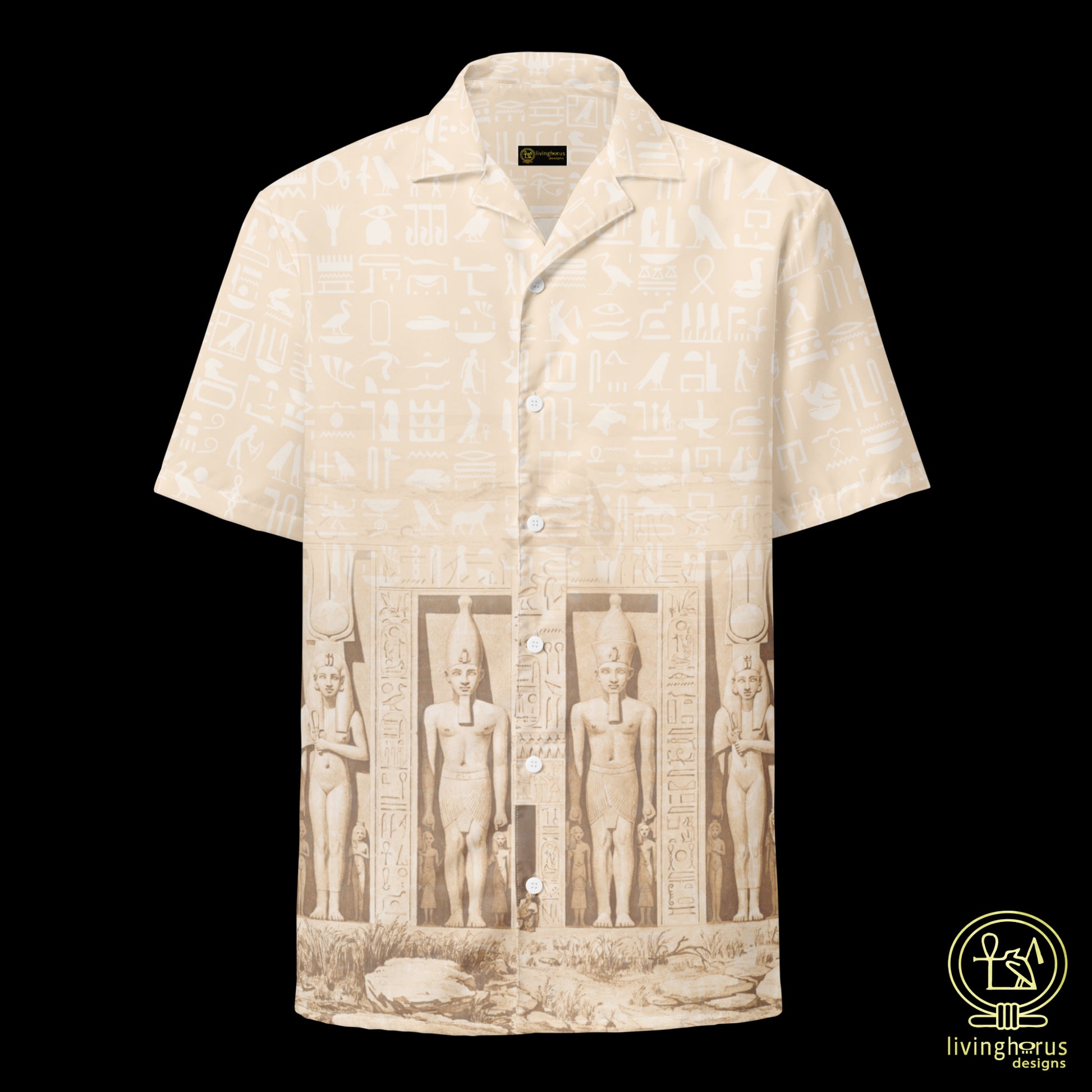 Introducing the Living Horus stunning Egyptian Temple - Abu Simbel Nefertari Hawaiian Shirt, the perfect addition to your summer wardrobe. Crafted with care from recycled polyester, this shirt seamlessly blends sustainability with style and is designed to keep you cool and comfortable during scorching summer days.