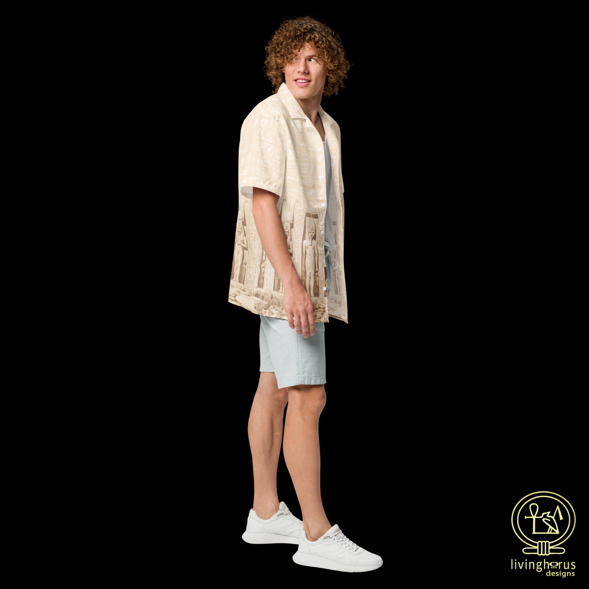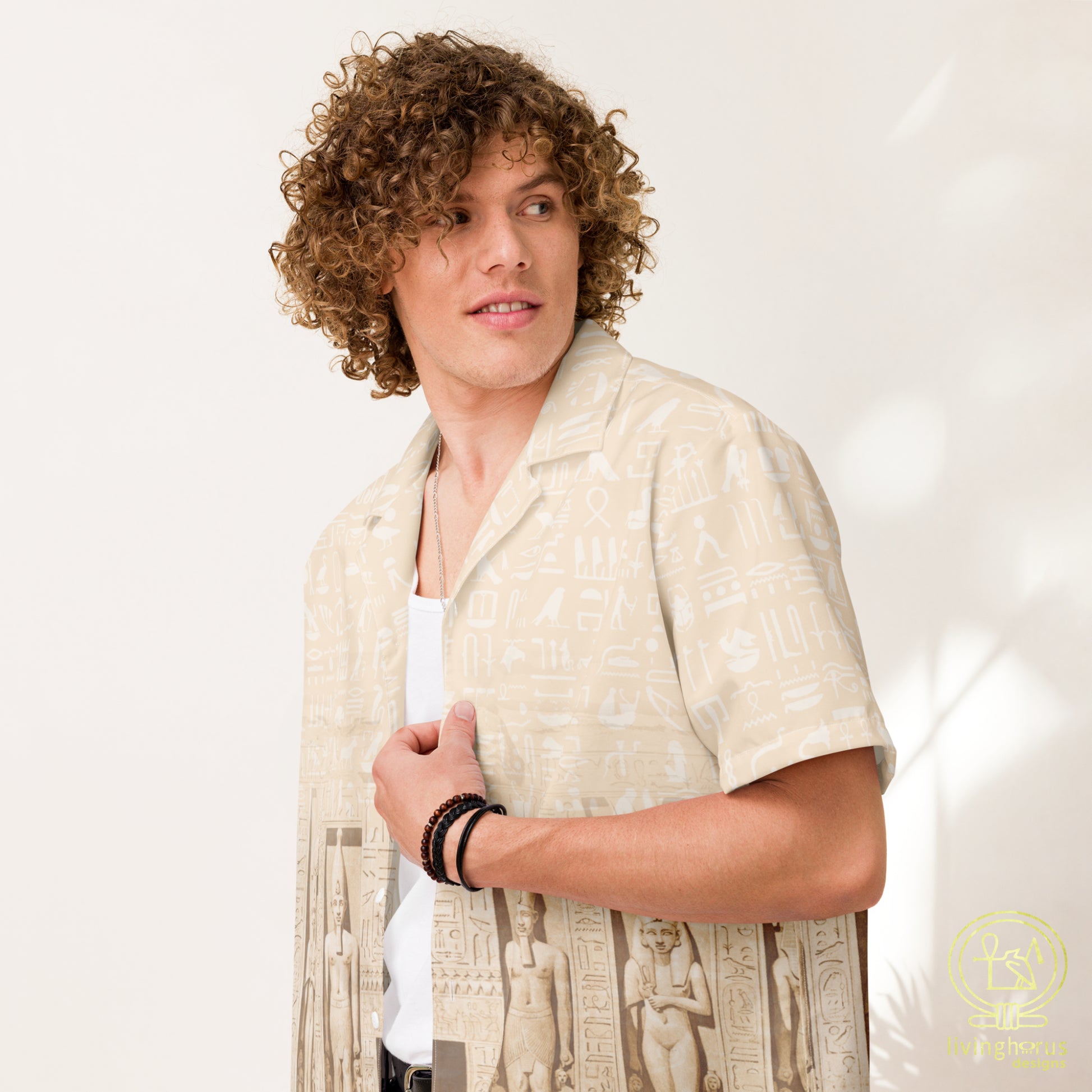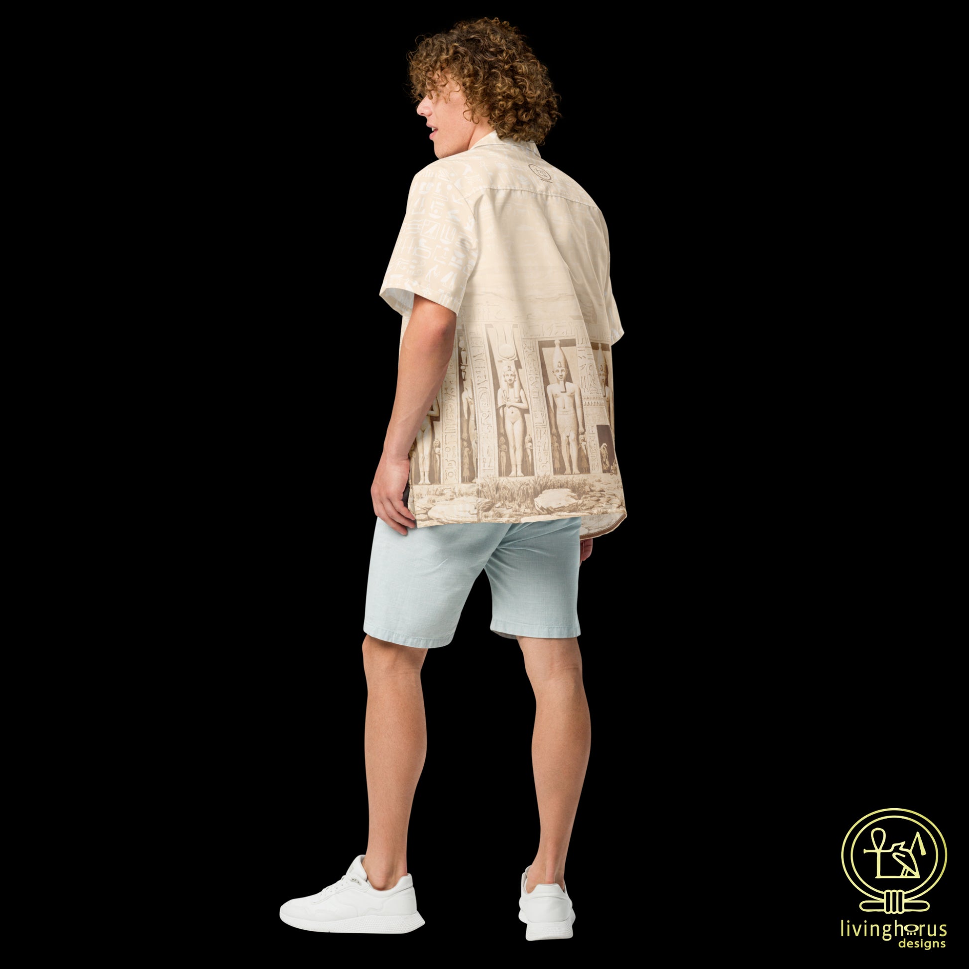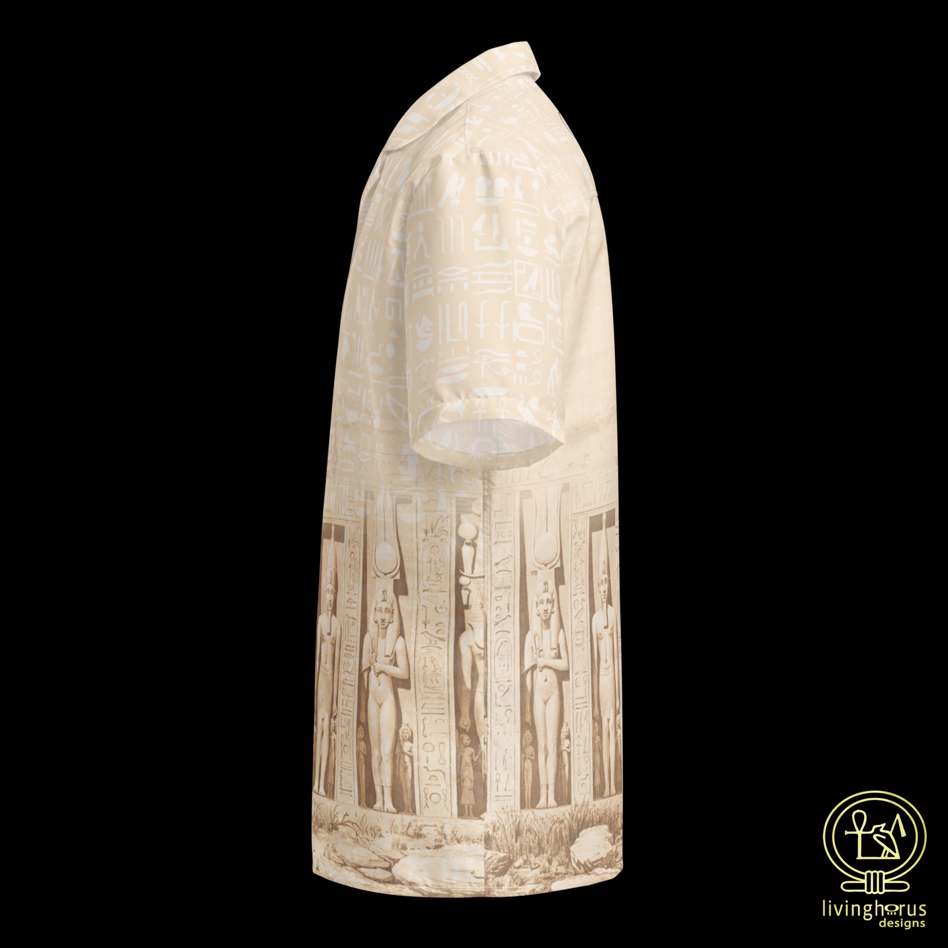 Introducing the Living Horus stunning Egyptian Temple - Abu Simbel Nefertari Hawaiian Shirt, the perfect addition to your summer wardrobe. Crafted with care from recycled polyester, this shirt seamlessly blends sustainability with style and is designed to keep you cool and comfortable during scorching summer days.