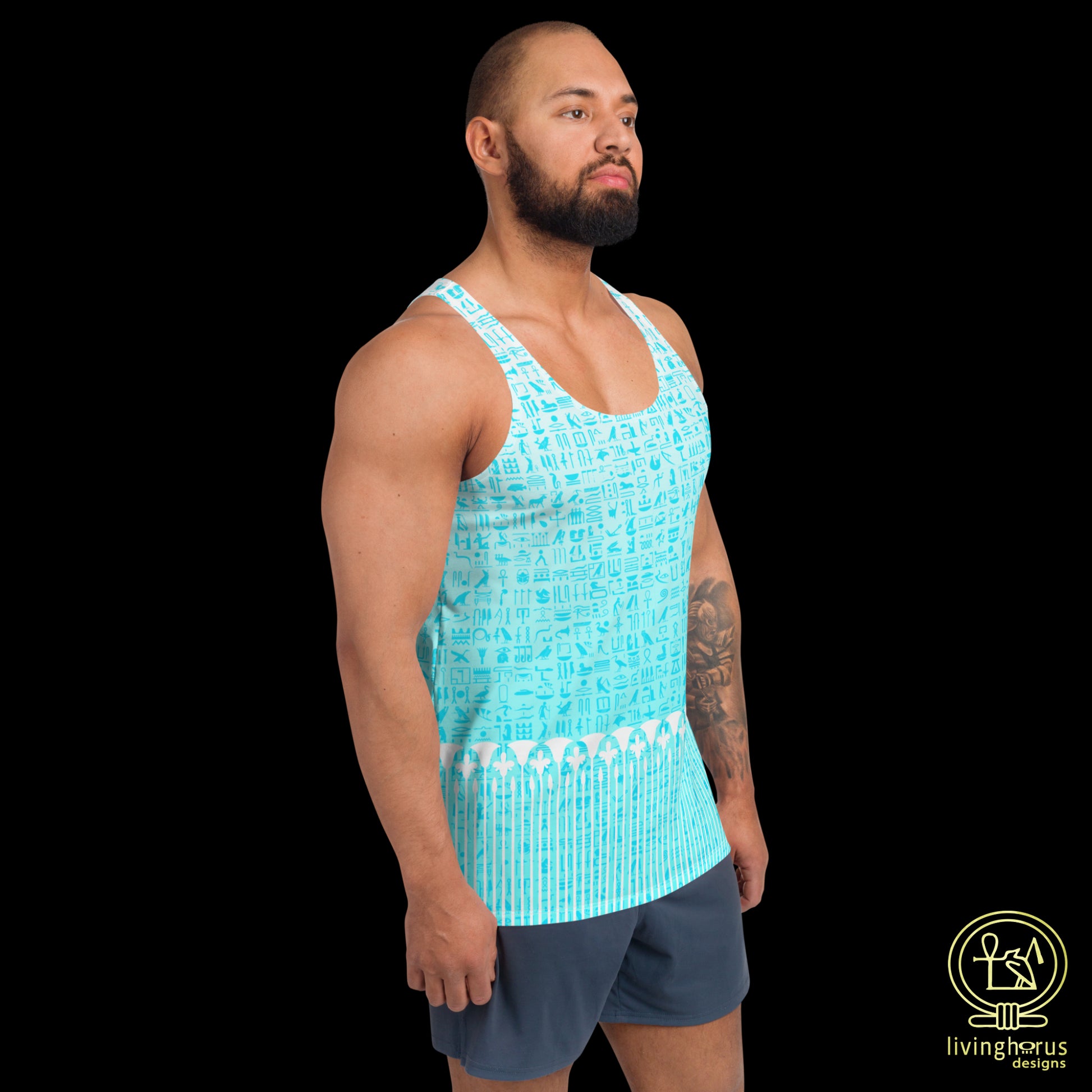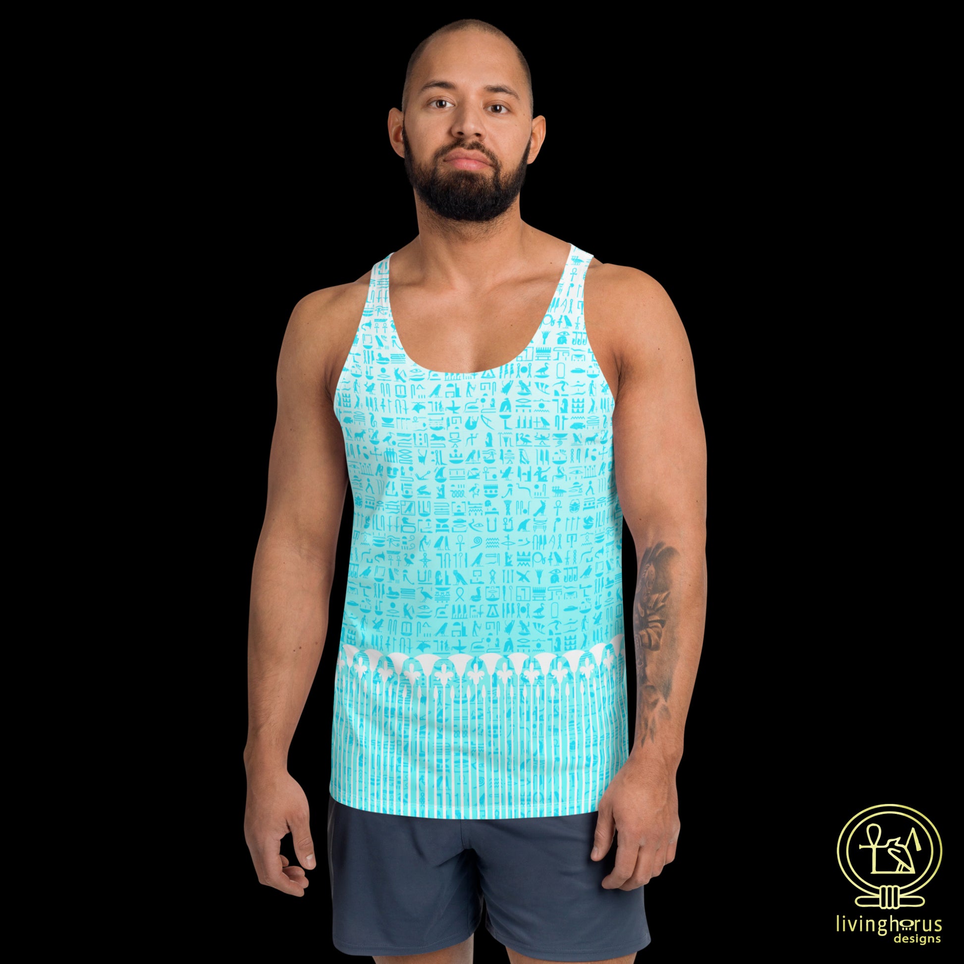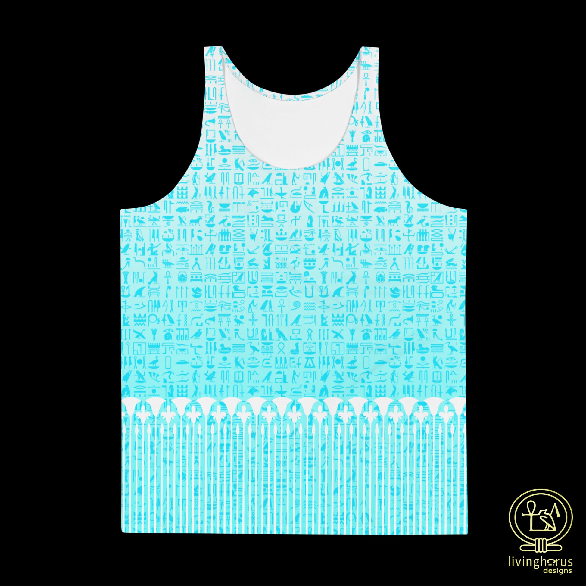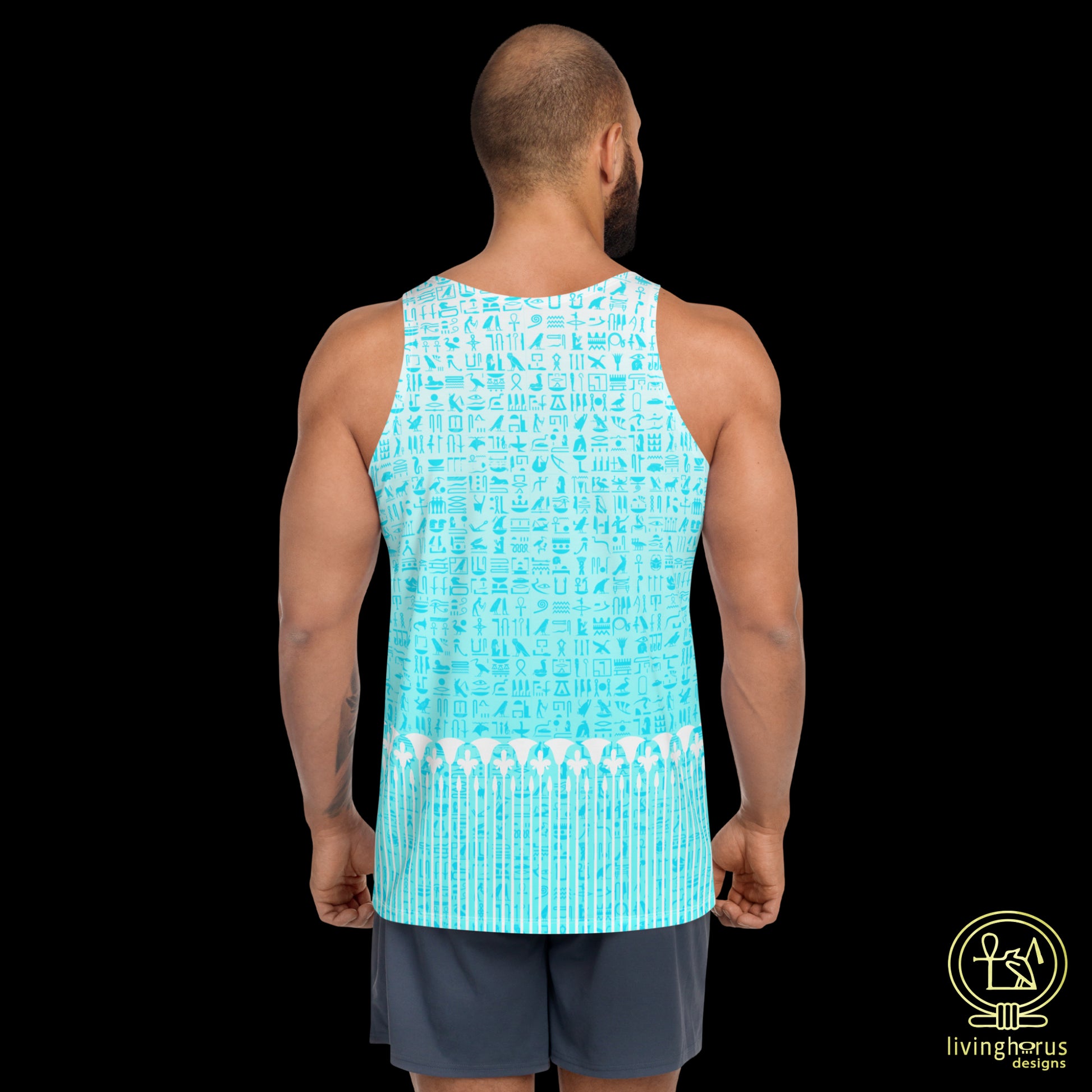 Embrace the mystique of the Language of the Gods, ancient Egyptian Hieroglyphics with this Living Horus Designs Light Blue Hieroglyph, Lotus Motif Tank Top. Finished with a classic Egyptian Lotus motif, this unisex tank top offers comfort and style, making it a must-have addition to your wardrobe for an effortlessly chic look this summer. This tank top has everything you could possibly need – vibrant colours, soft material, and a relaxed fit that will make you look fabulous!
