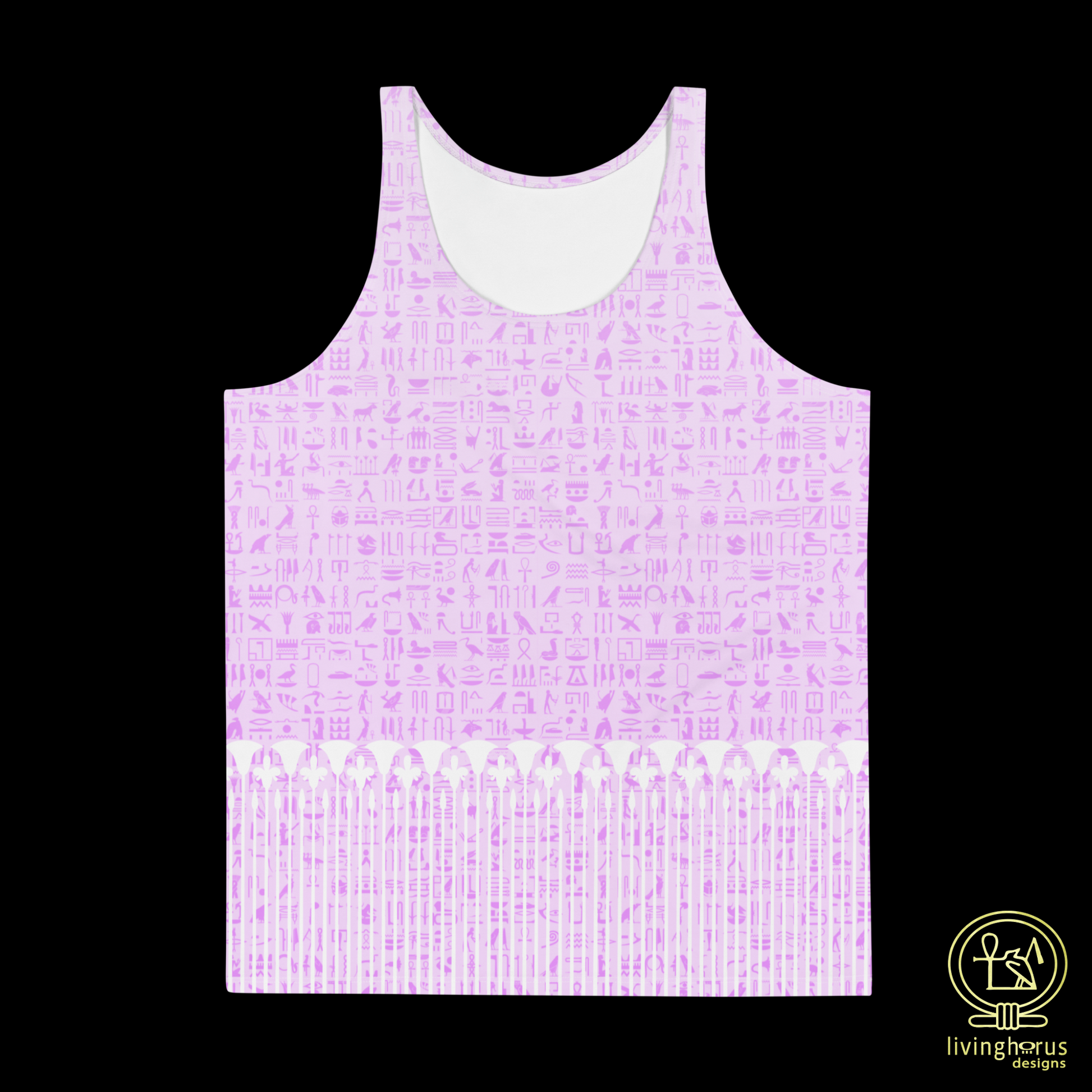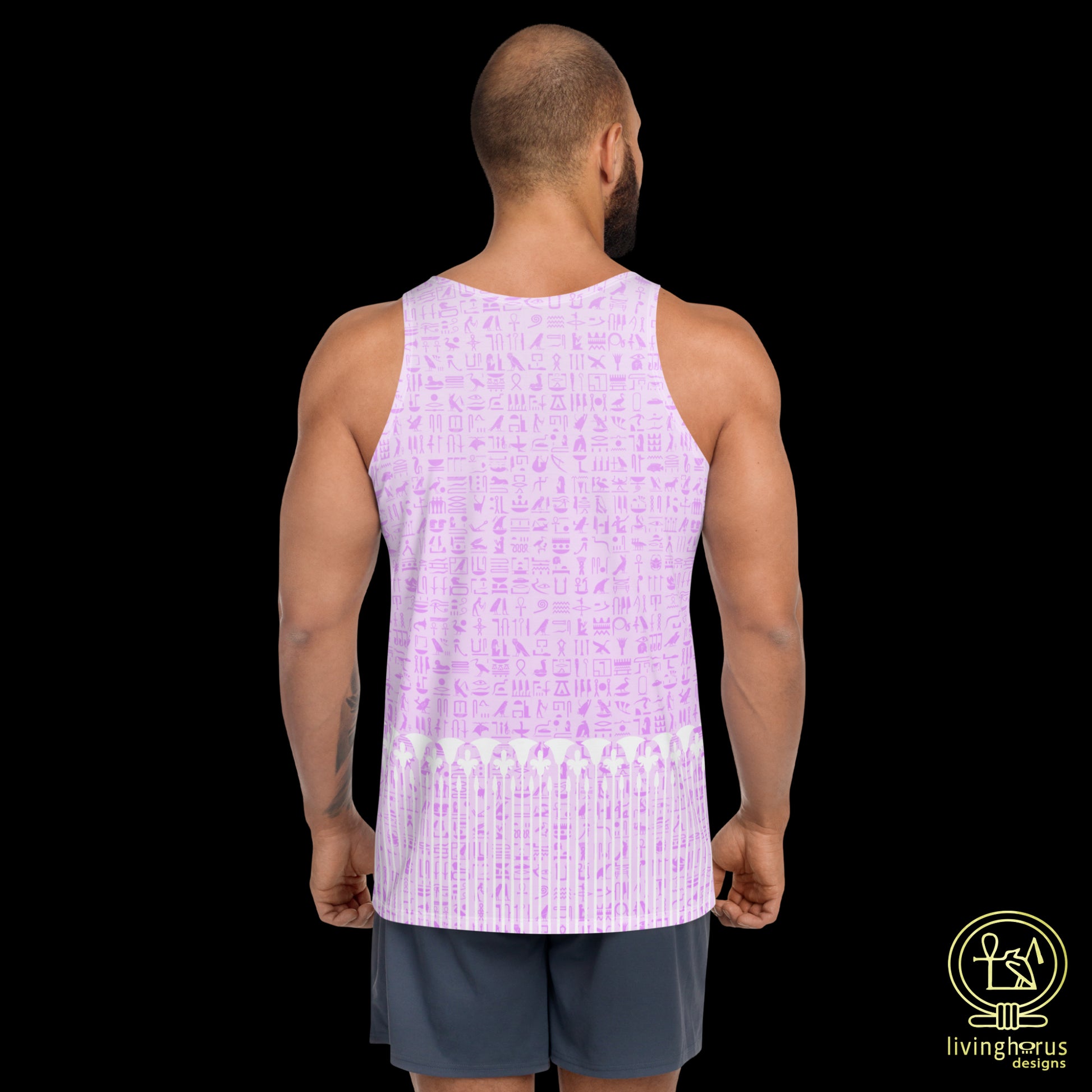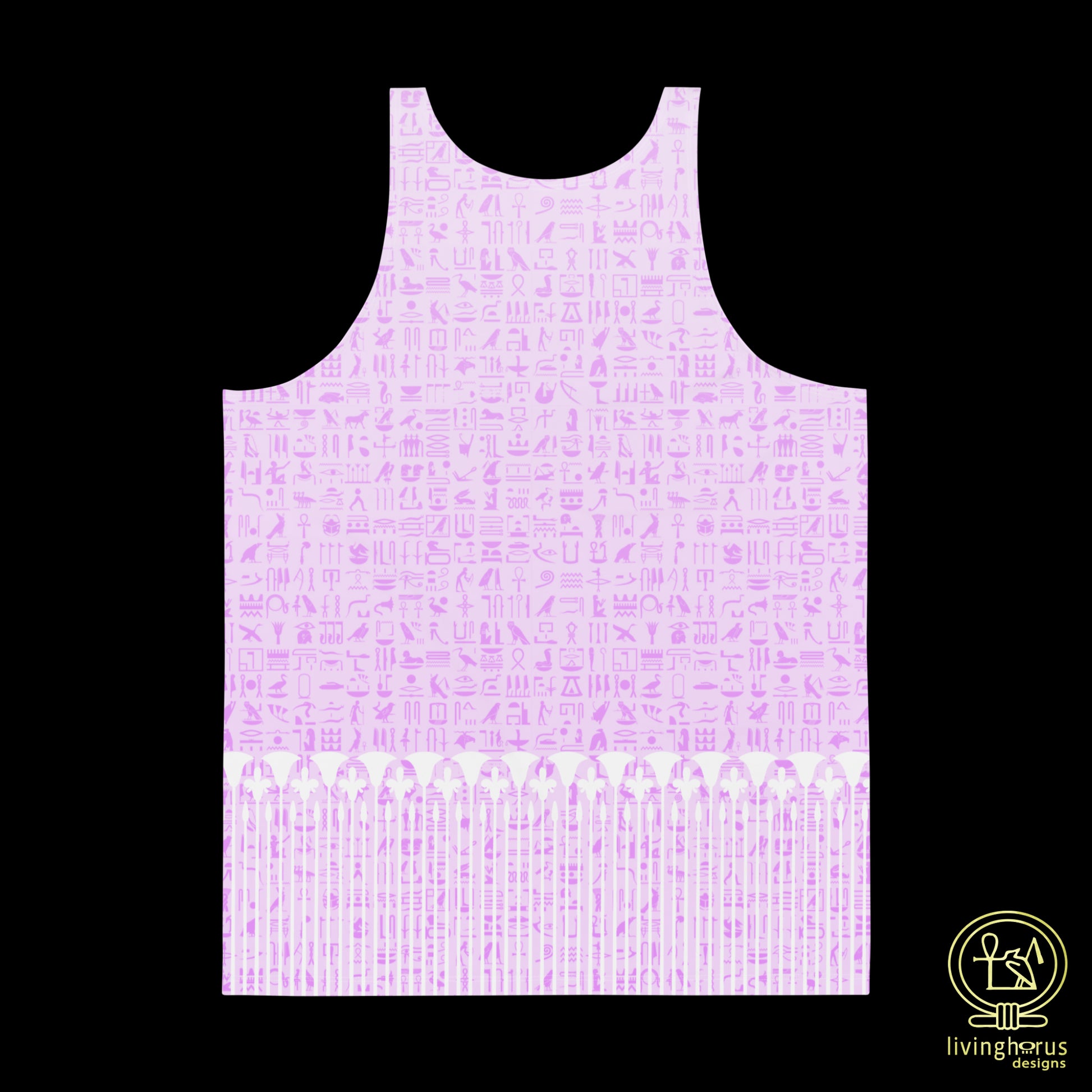 Embrace the mystique of the Language of the Gods, ancient Egyptian Hieroglyphics with this Living Horus Designs Pink Hieroglyph, Lotus Motif Tank Top. This unisex tank top offers comfort and style, making it a must-have addition to your wardrobe for an effortlessly chic look this summer. This tank top has everything you could possibly need – vibrant colours, soft material, and a relaxed fit that will make you look fabulous!