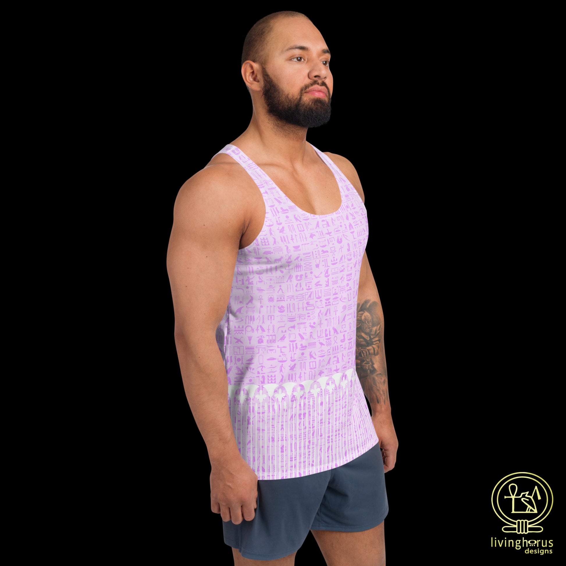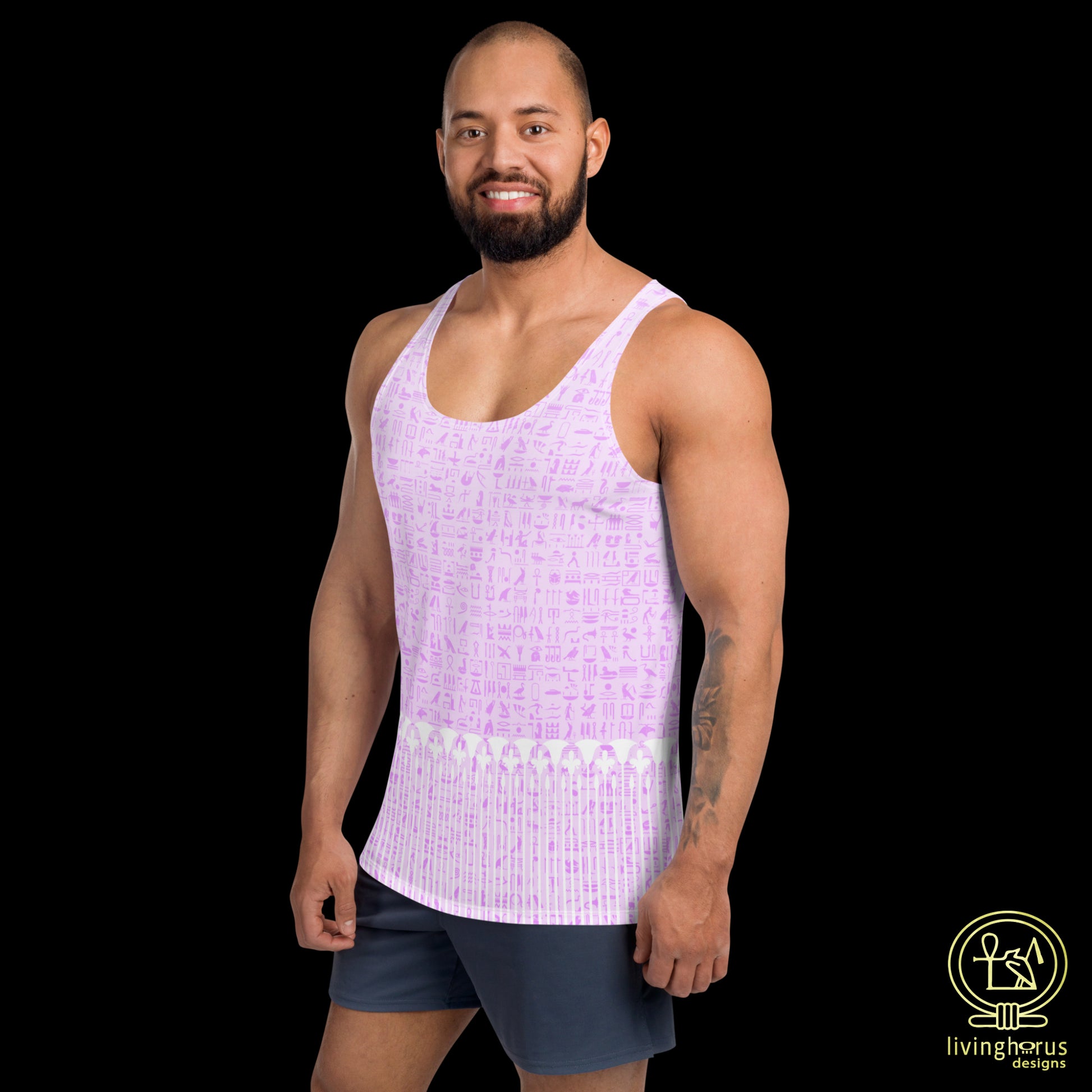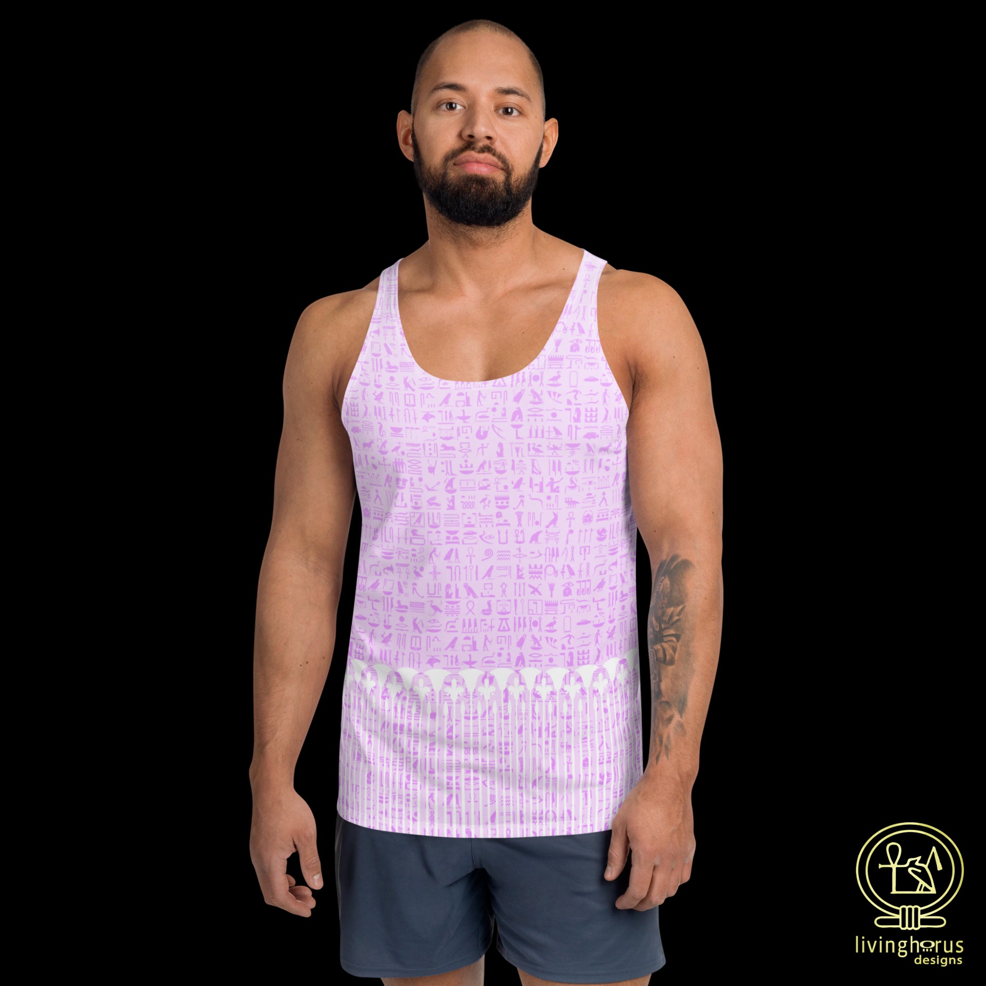 Embrace the mystique of the Language of the Gods, ancient Egyptian Hieroglyphics with this Living Horus Designs Pink Hieroglyph, Lotus Motif Tank Top. This unisex tank top offers comfort and style, making it a must-have addition to your wardrobe for an effortlessly chic look this summer. This tank top has everything you could possibly need – vibrant colours, soft material, and a relaxed fit that will make you look fabulous!