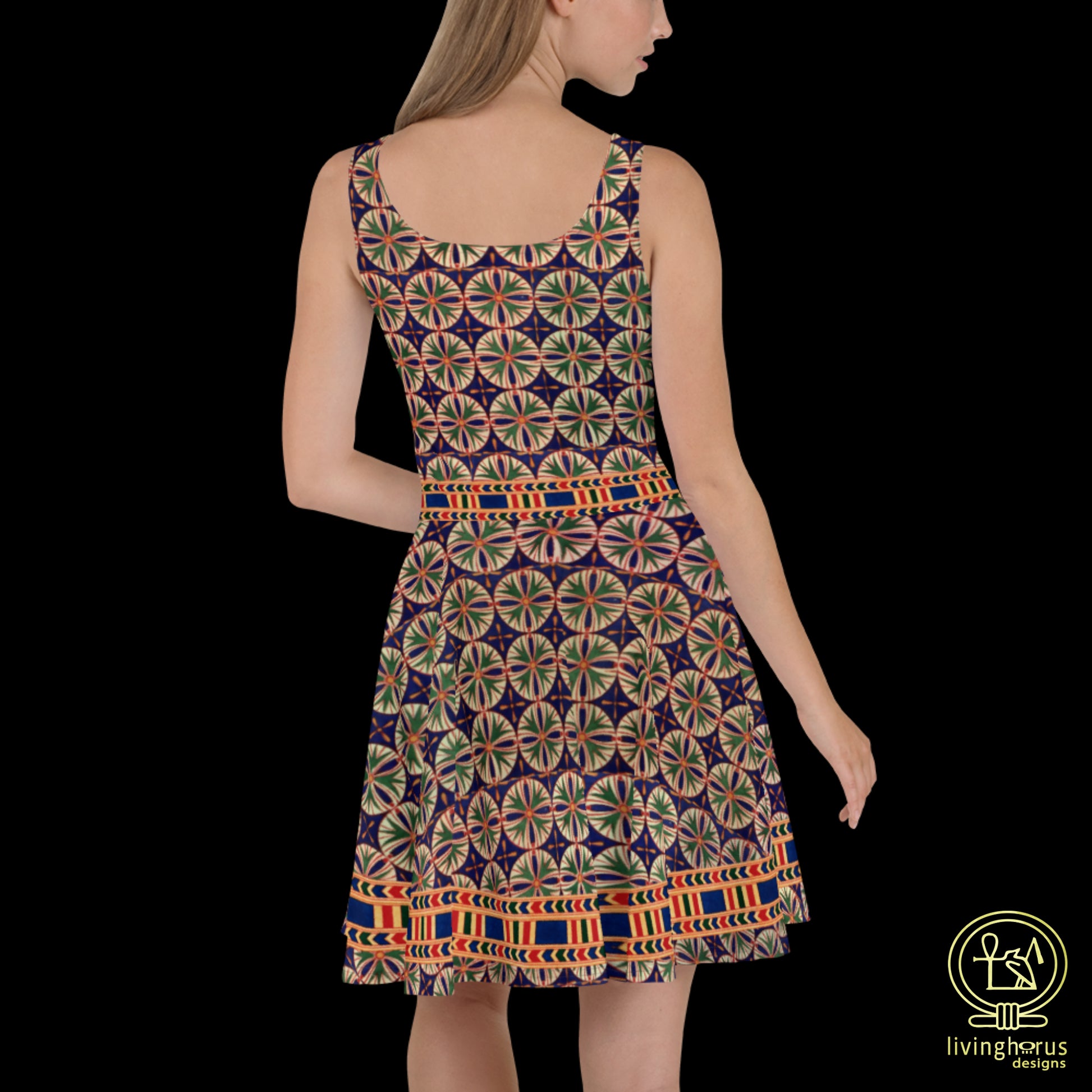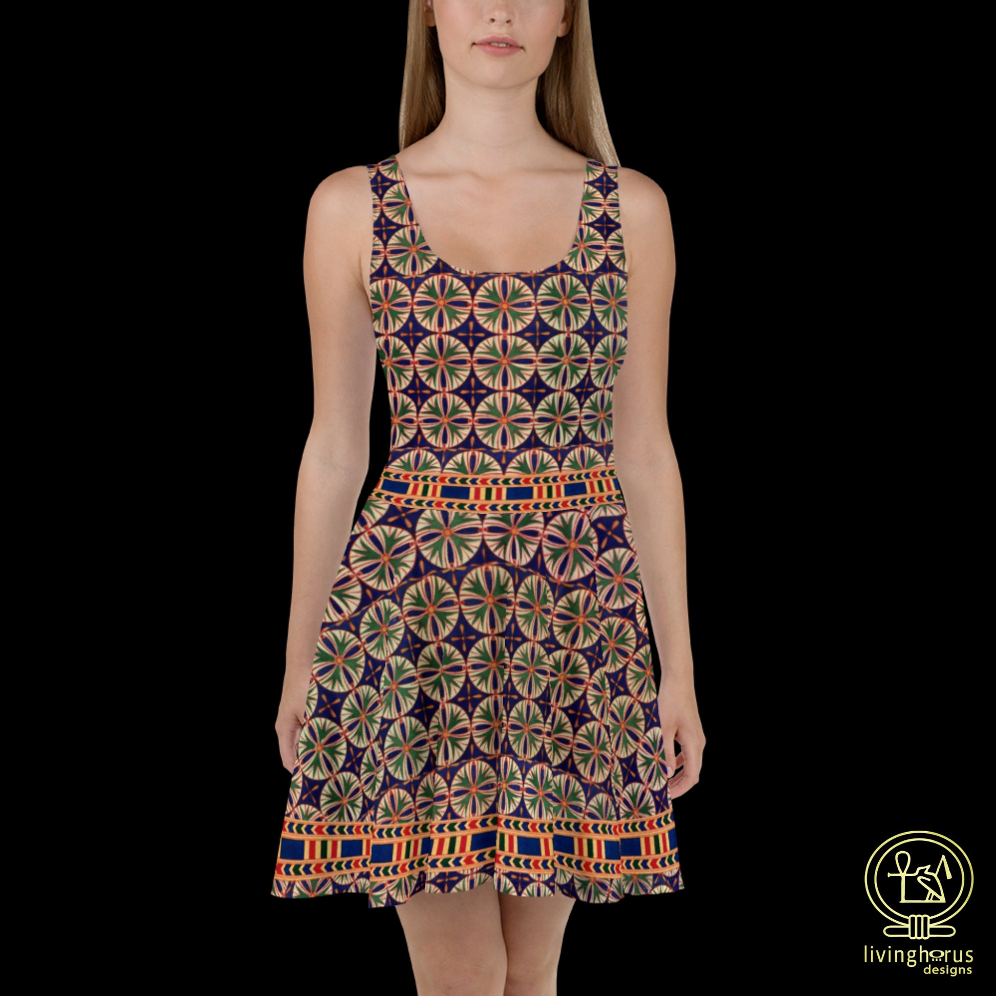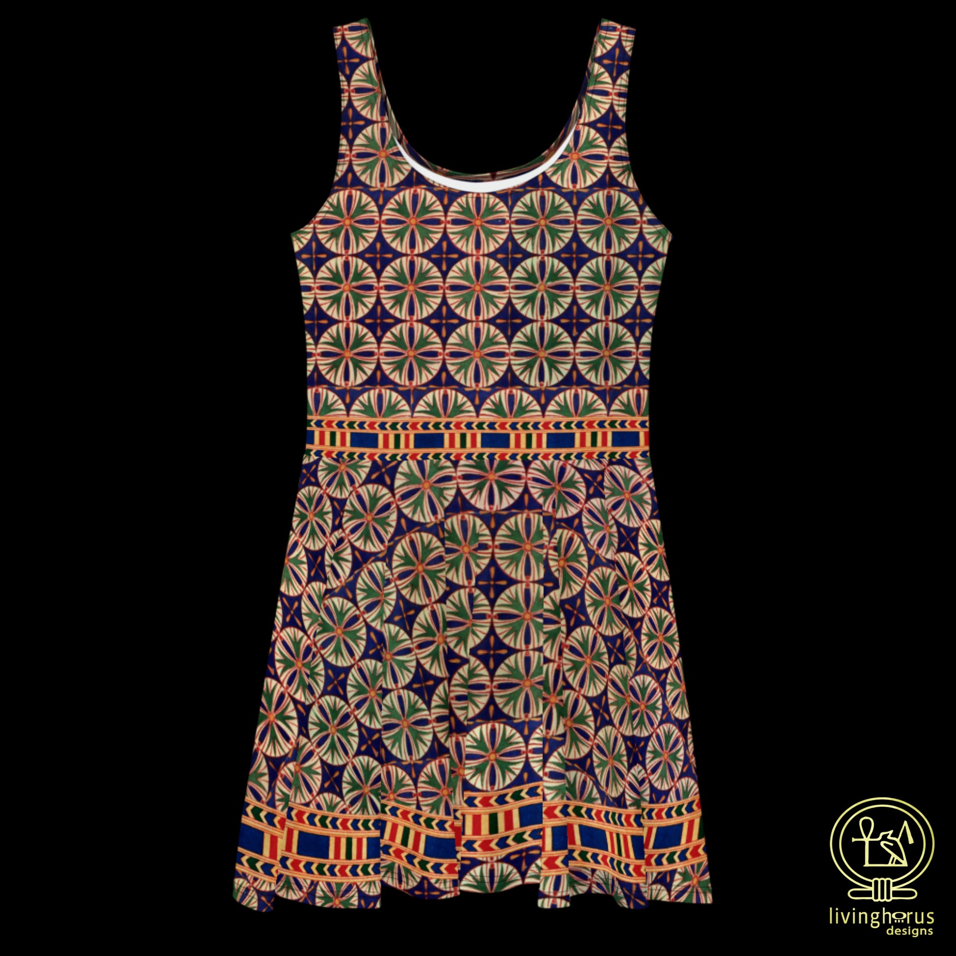 Dress to impress with this vibrant, sleeveless ancient Egyptian blue/green floral patterned skater dress! With a design based on a border decoration popular in Egyptian tombs, palaces and homes, the soft fabric and flared skirt give it an elegant twist that brings out the intricate design with a beautiful vibrancy.