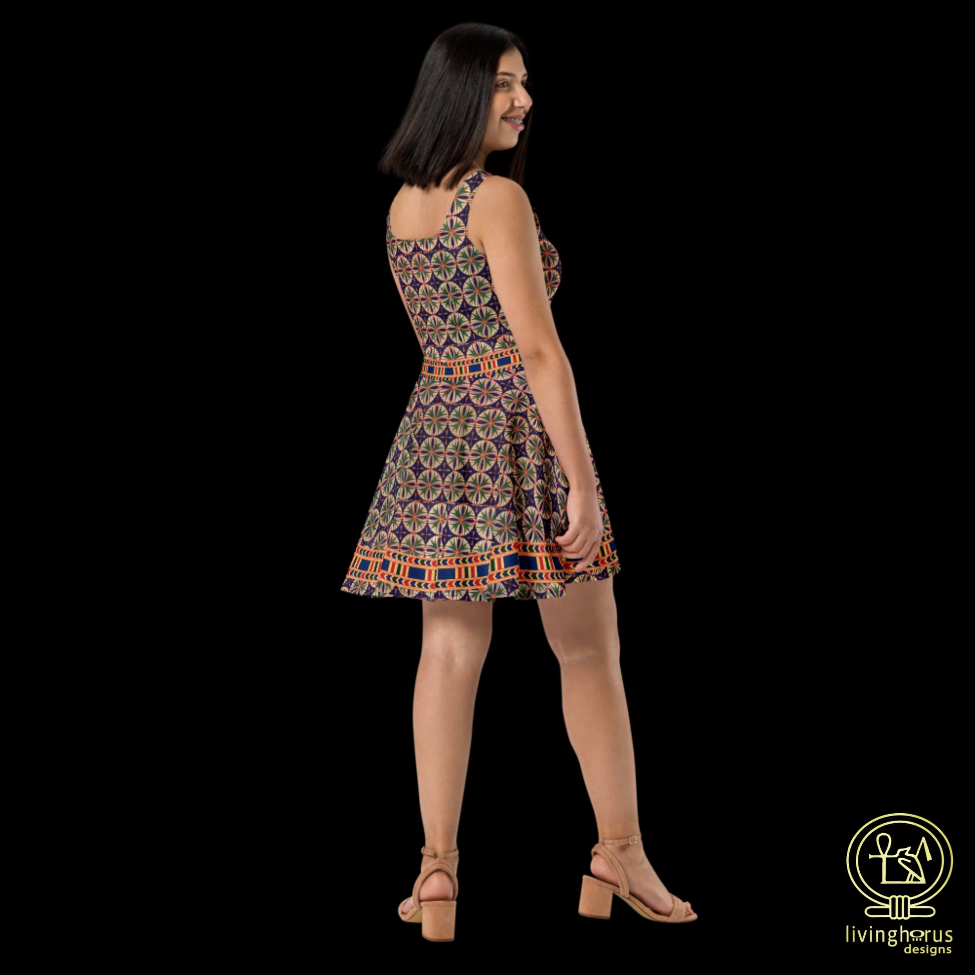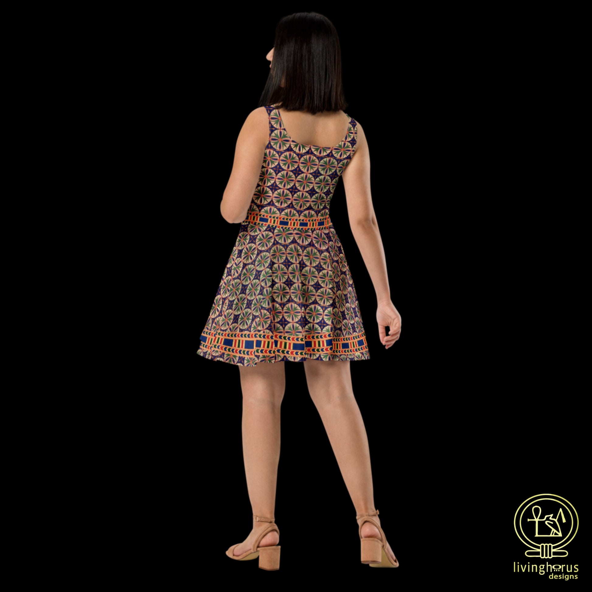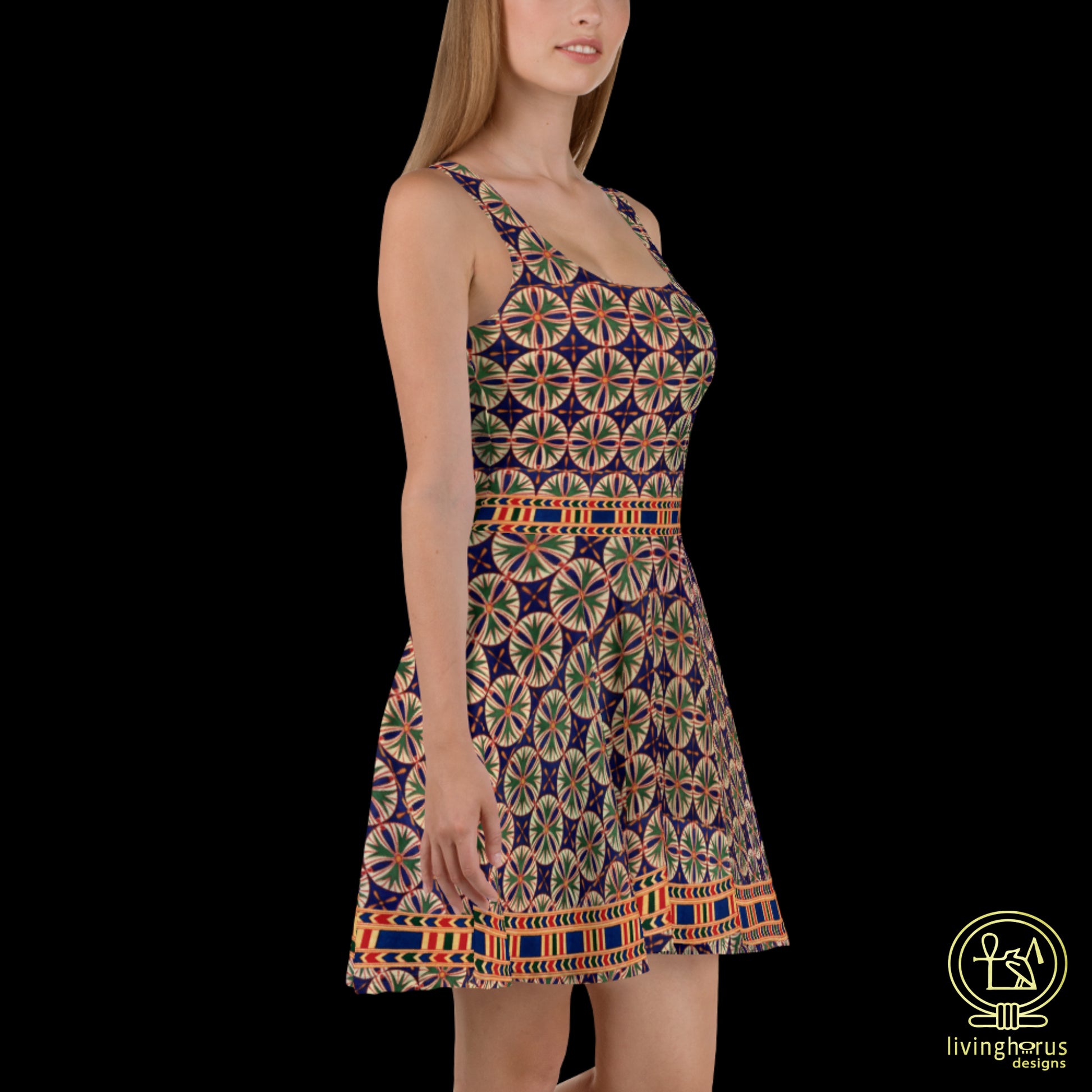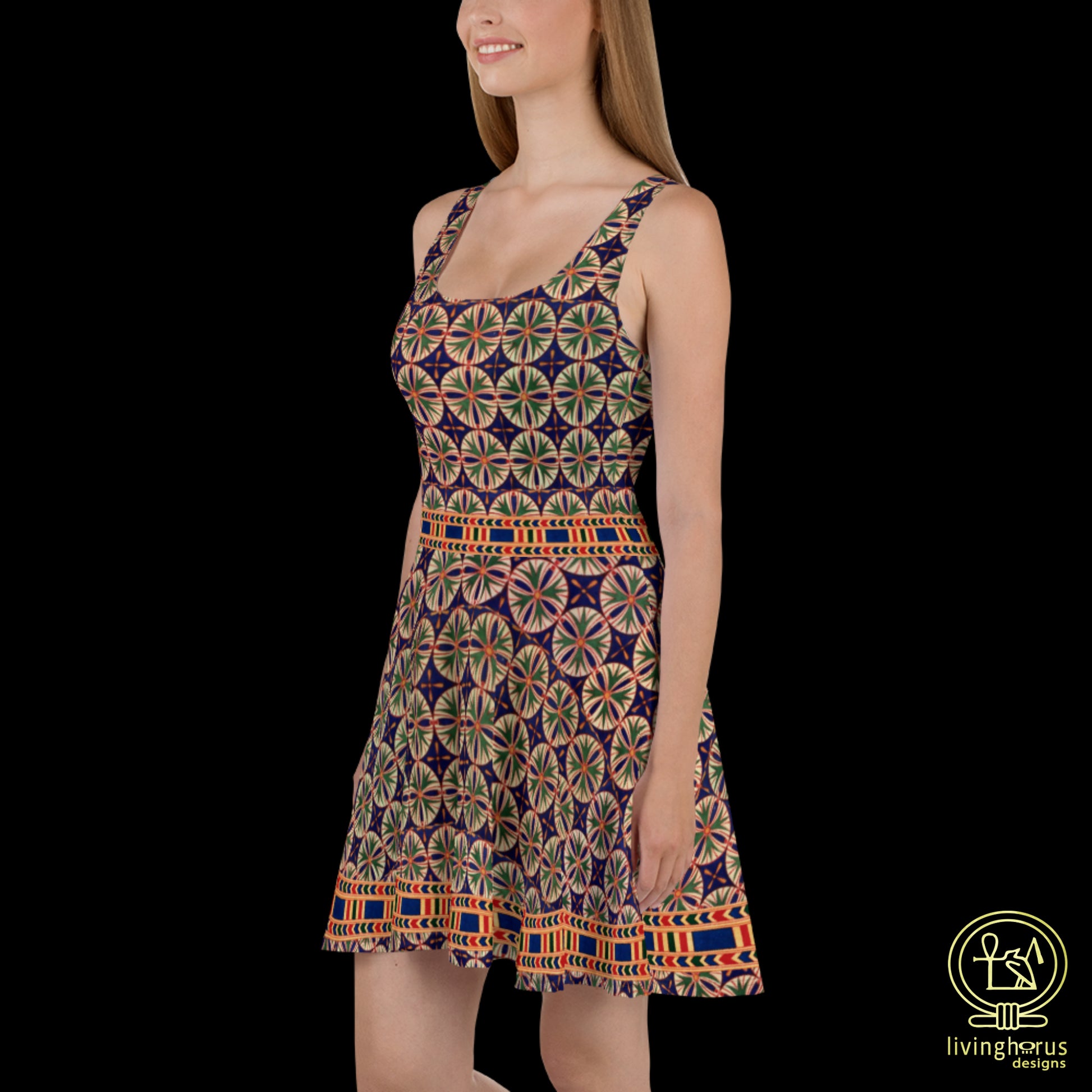 Dress to impress with this vibrant, sleeveless ancient Egyptian blue/green floral patterned skater dress! With a design based on a border decoration popular in Egyptian tombs, palaces and homes, the soft fabric and flared skirt give it an elegant twist that brings out the intricate design with a beautiful vibrancy.