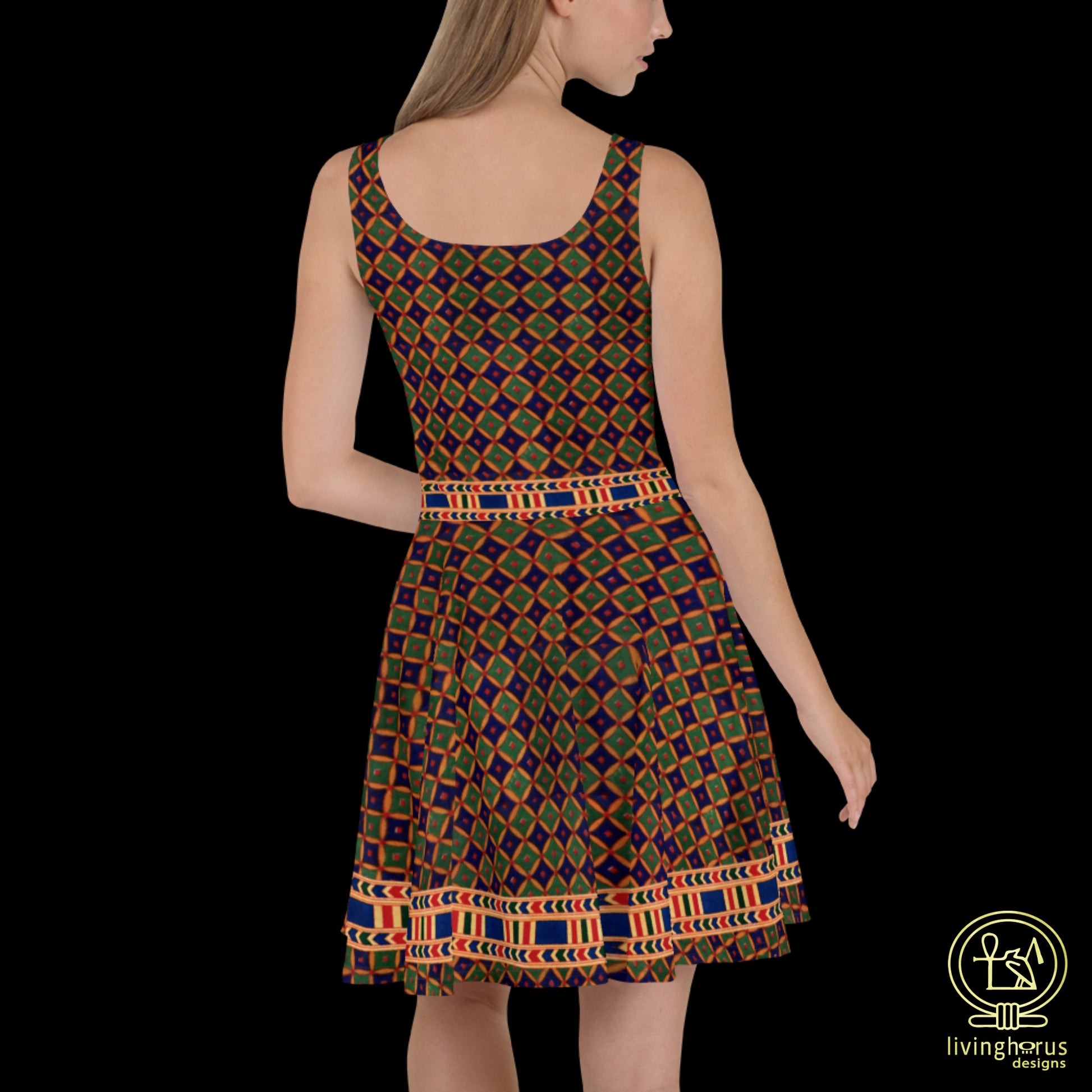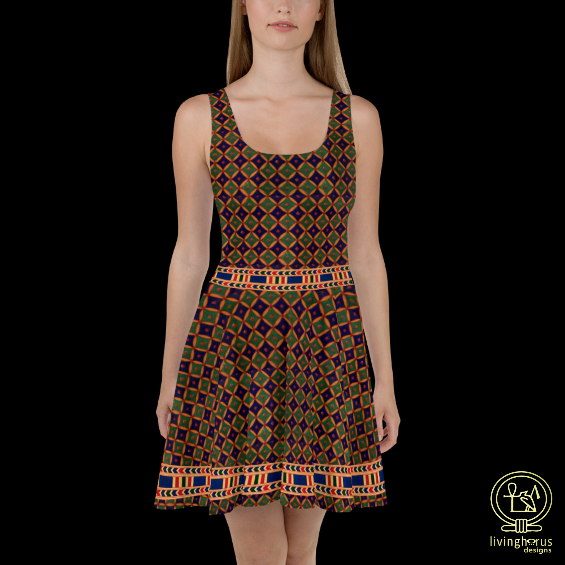 Dress to impress with this vibrant, sleeveless ancient Egyptian blue/green diamond patterned skater dress! With a design based on a border decoration popular in Egyptian tombs, palaces and homes, the soft fabric and flared skirt give it an elegant twist that brings out the intricate design with a beautiful vibrancy.