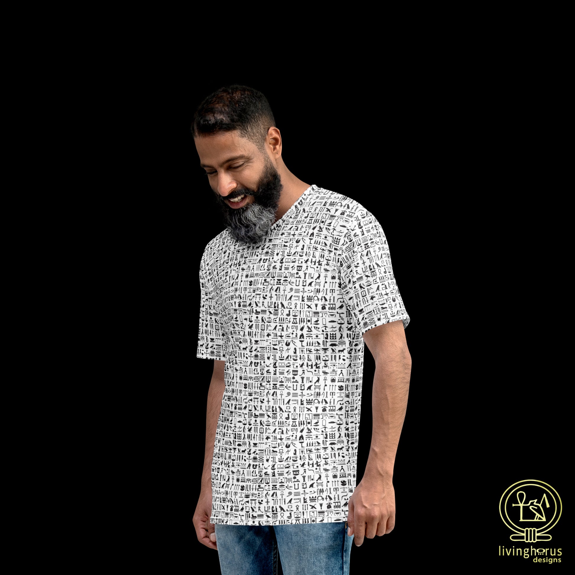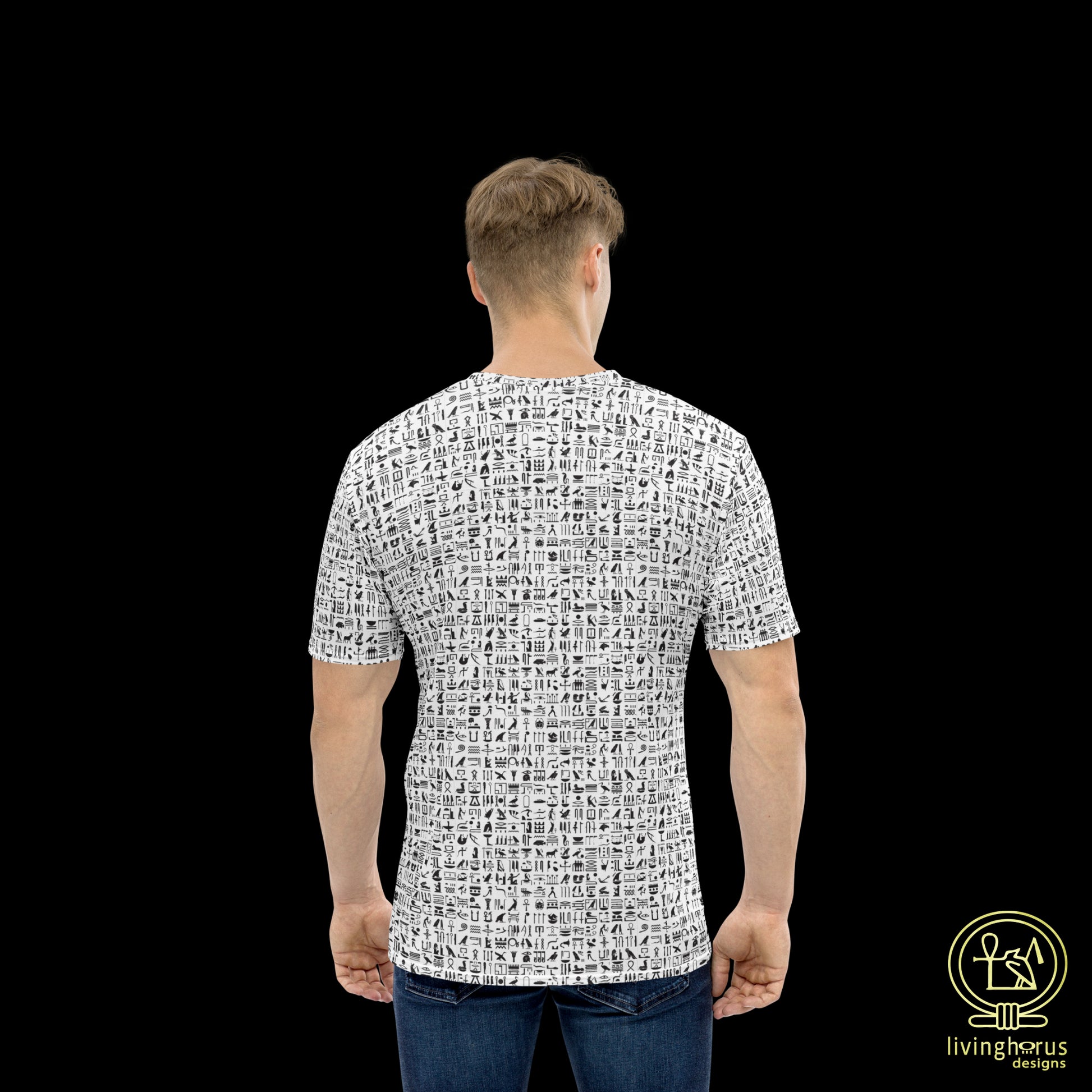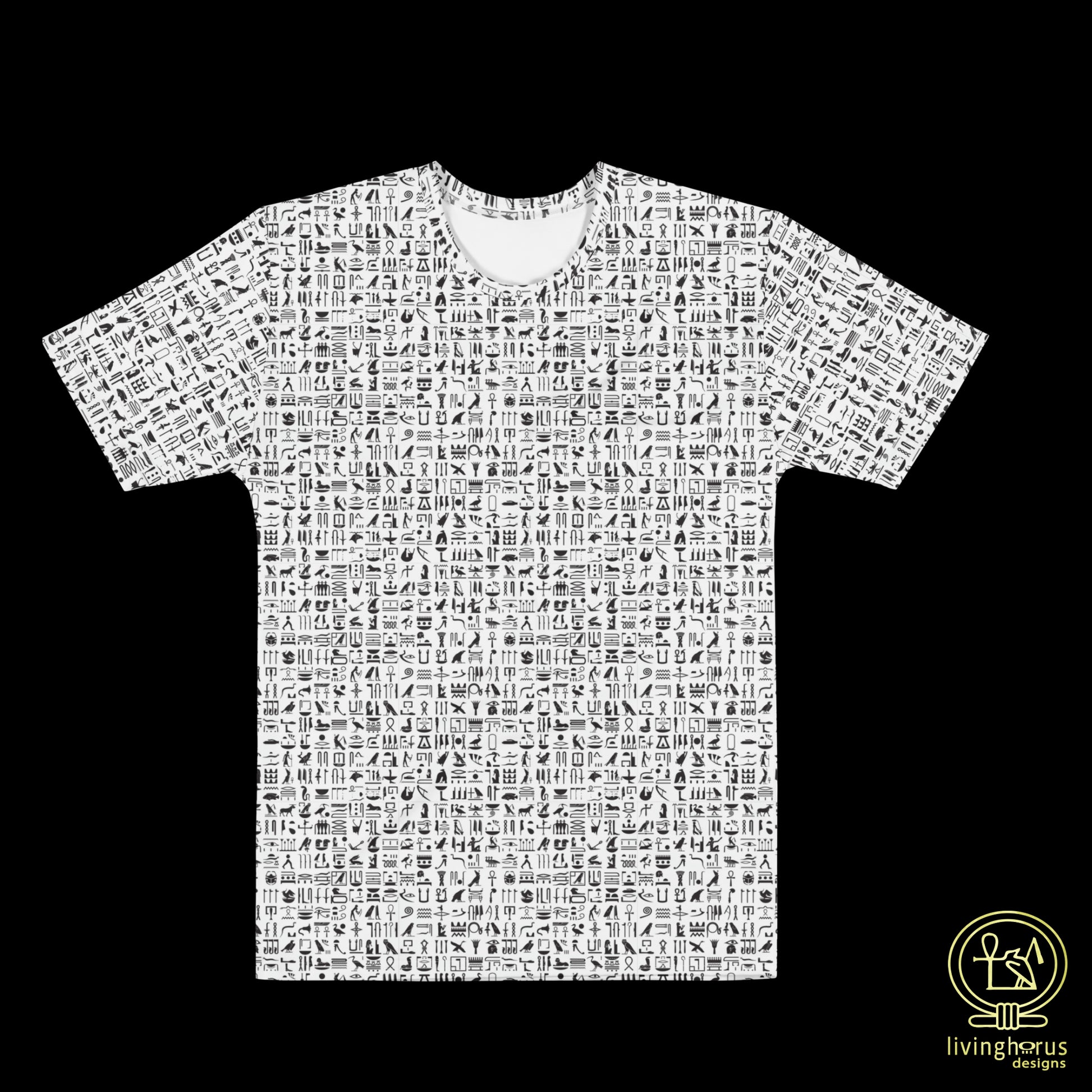 Embrace timeless elegance and ancient artistry with the Living Horus Designs White Hieroglyph Tee Shirt. This exceptional piece features striking black hieroglyphs meticulously printed on a pristine white background, creating a bold and captivating contrast.