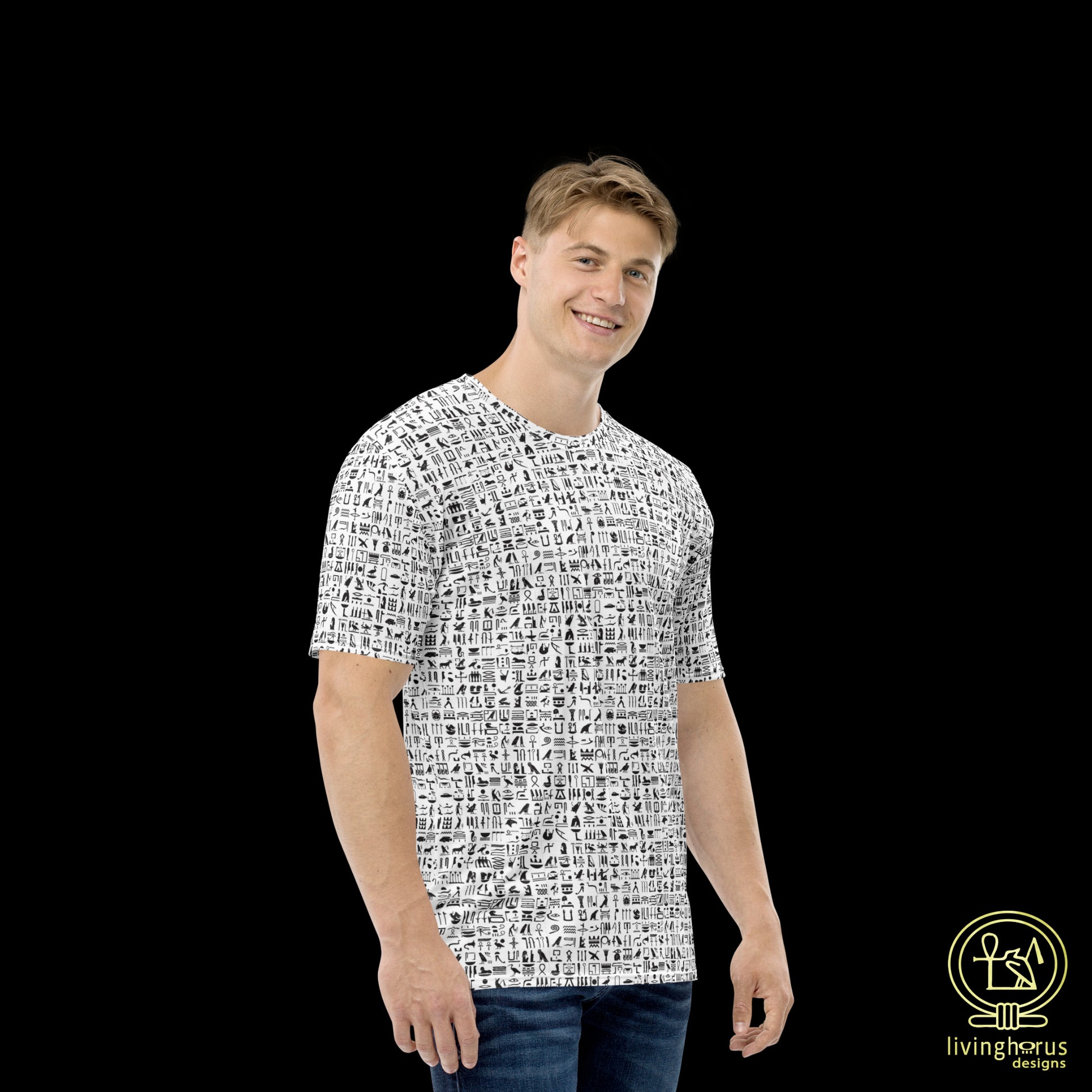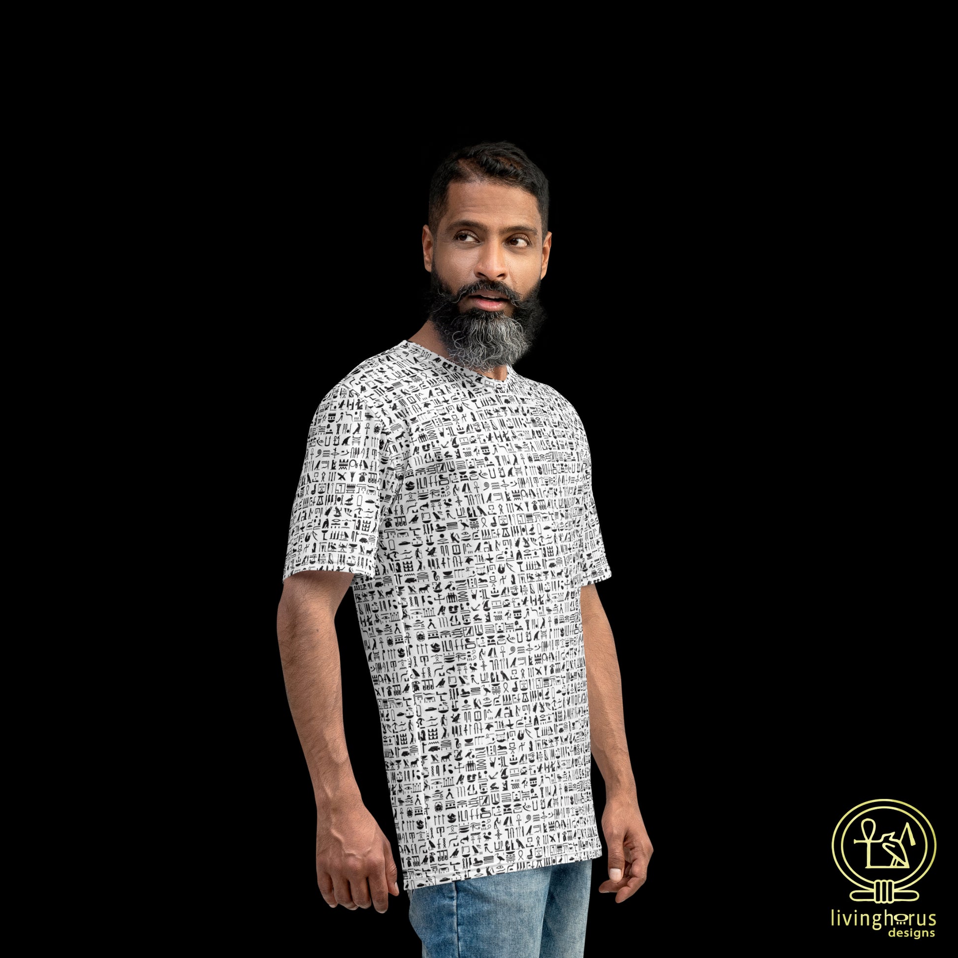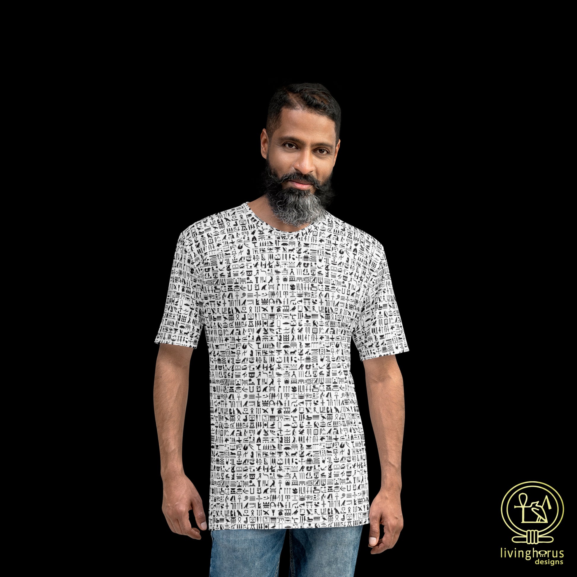 Embrace timeless elegance and ancient artistry with the Living Horus Designs White Hieroglyph Tee Shirt. This exceptional piece features striking black hieroglyphs meticulously printed on a pristine white background, creating a bold and captivating contrast.